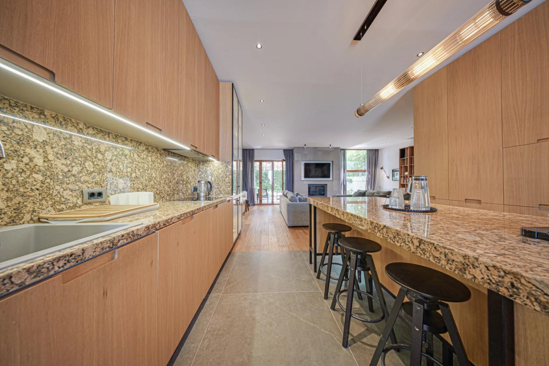 Къщата съчетава усещането за уют и пространство - светла дневна с камина, кухня с впечатляващ остров и естествена връзка към покрита веранда и тих, озеленен двор.
