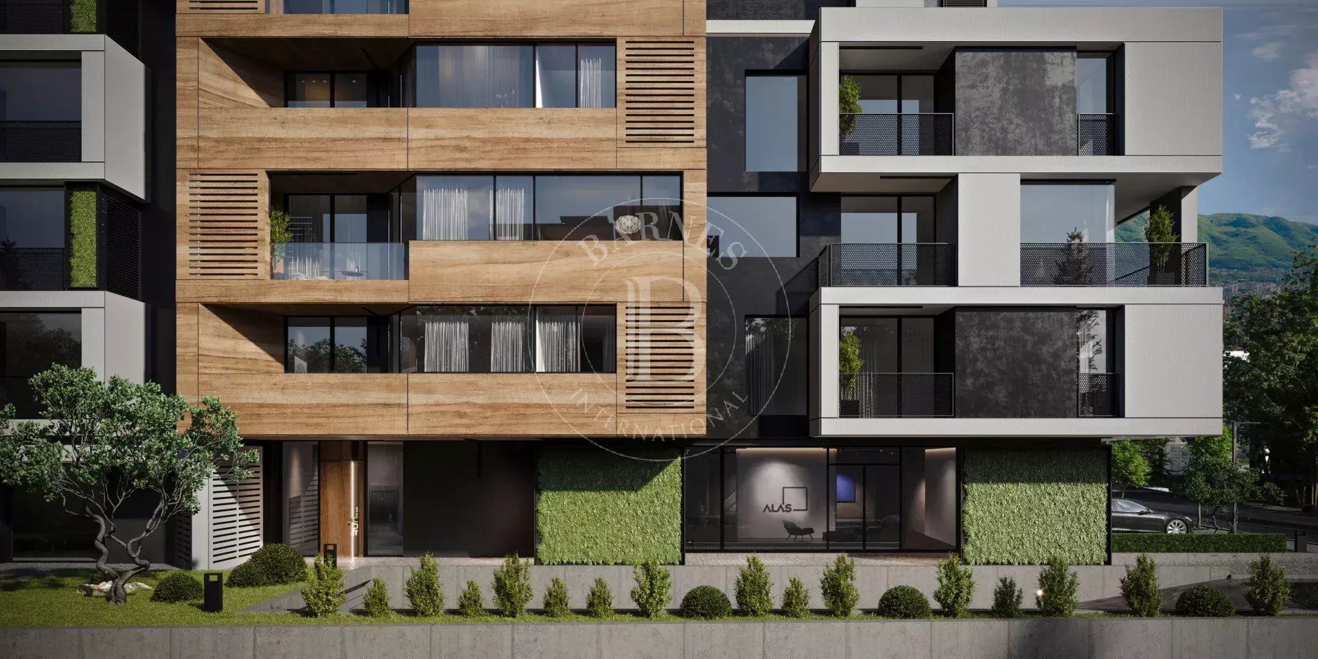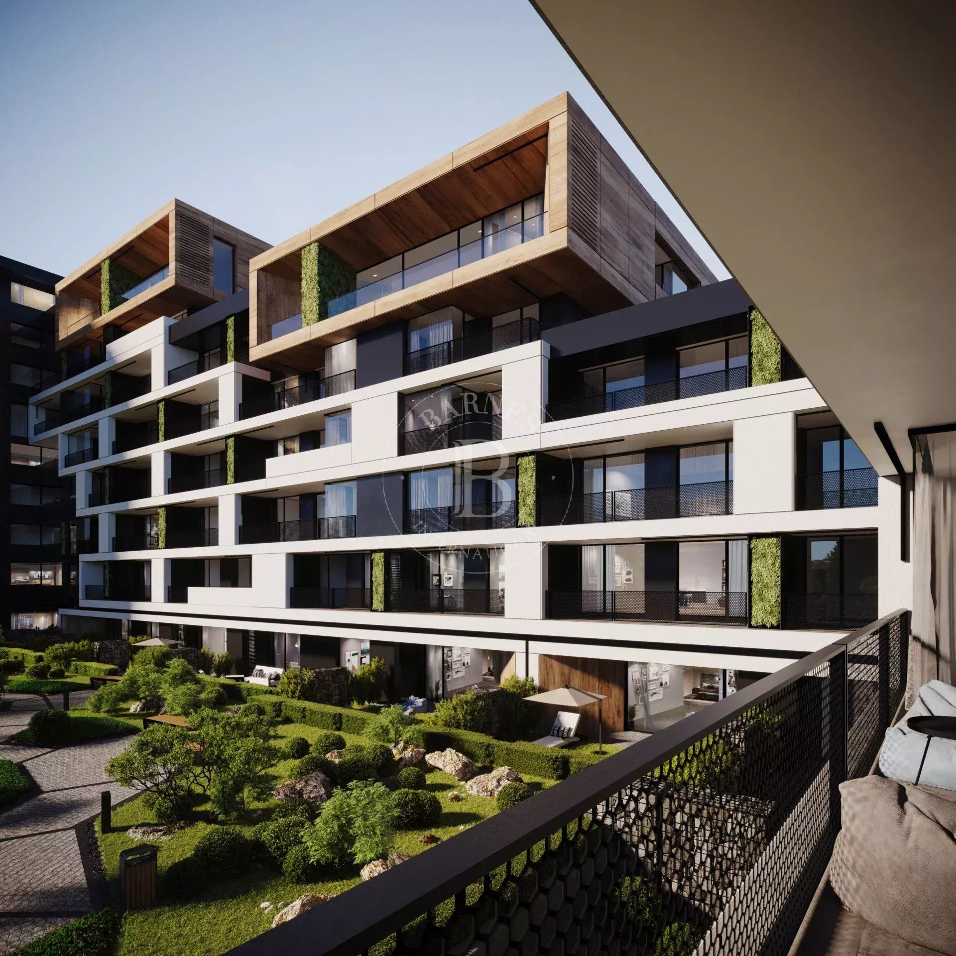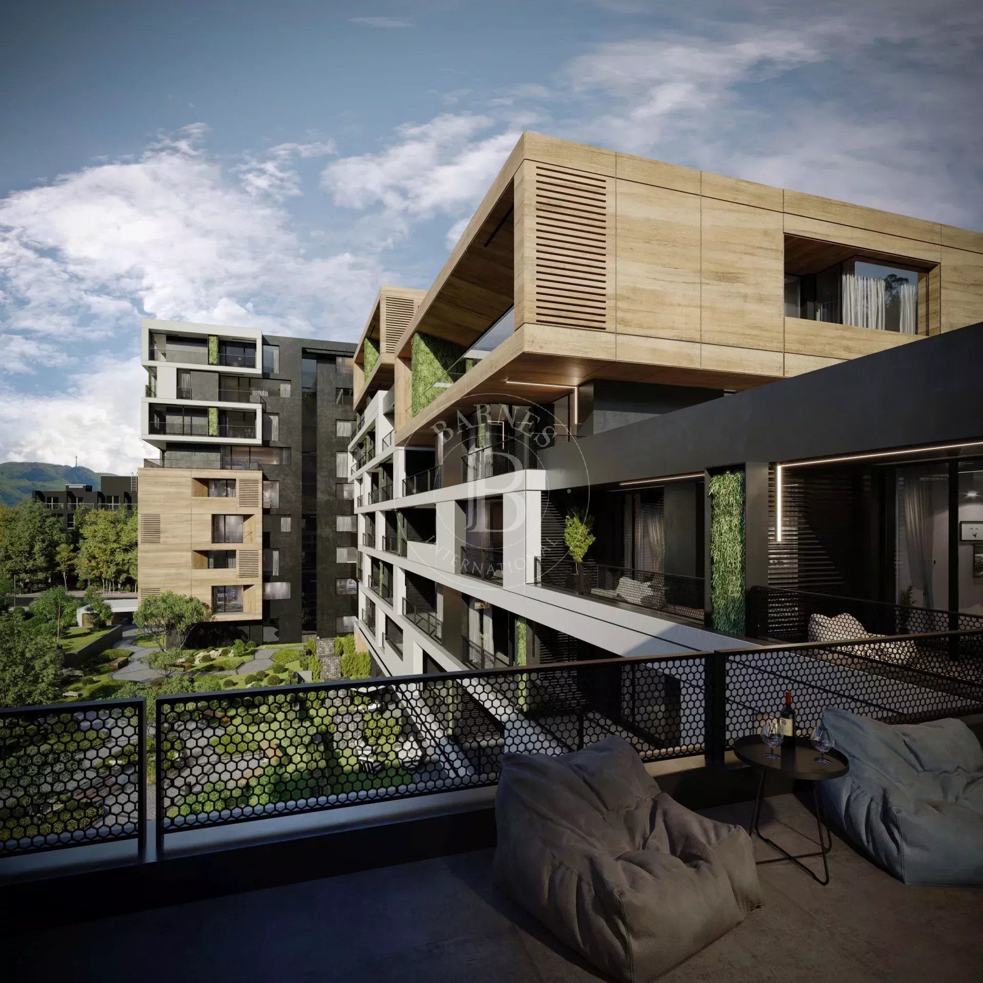 The sought-after play in the plasticity of protruding and recessed glass volumes in the overall façade is combined with a motif of vertical green walls, aesthetically concealing air conditioning units. All terraces, including those on the top floor, are designed to be covered in order to provide shade. The flooring of the terraces is a double floor type made of granite tiles. The openwork railings are available in two versions - glass triplex or with a metal frame with expanded metal mesh in black according to the architectural detail, following the compositional idea. The additional composition of the linear LED facade lighting is deliberately sought to emphasize the main idea at night. The idea of the dynamic composition is continued in the landscaping project of the main courtyard of the complex in combination with gabions, park furniture and lighting, and a water area.