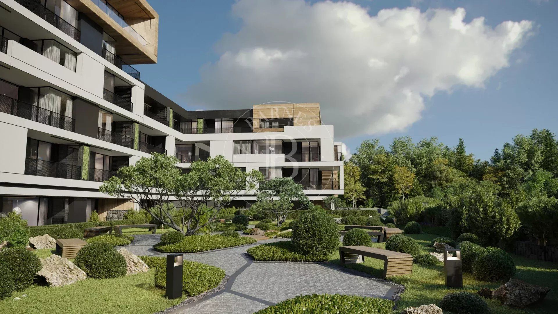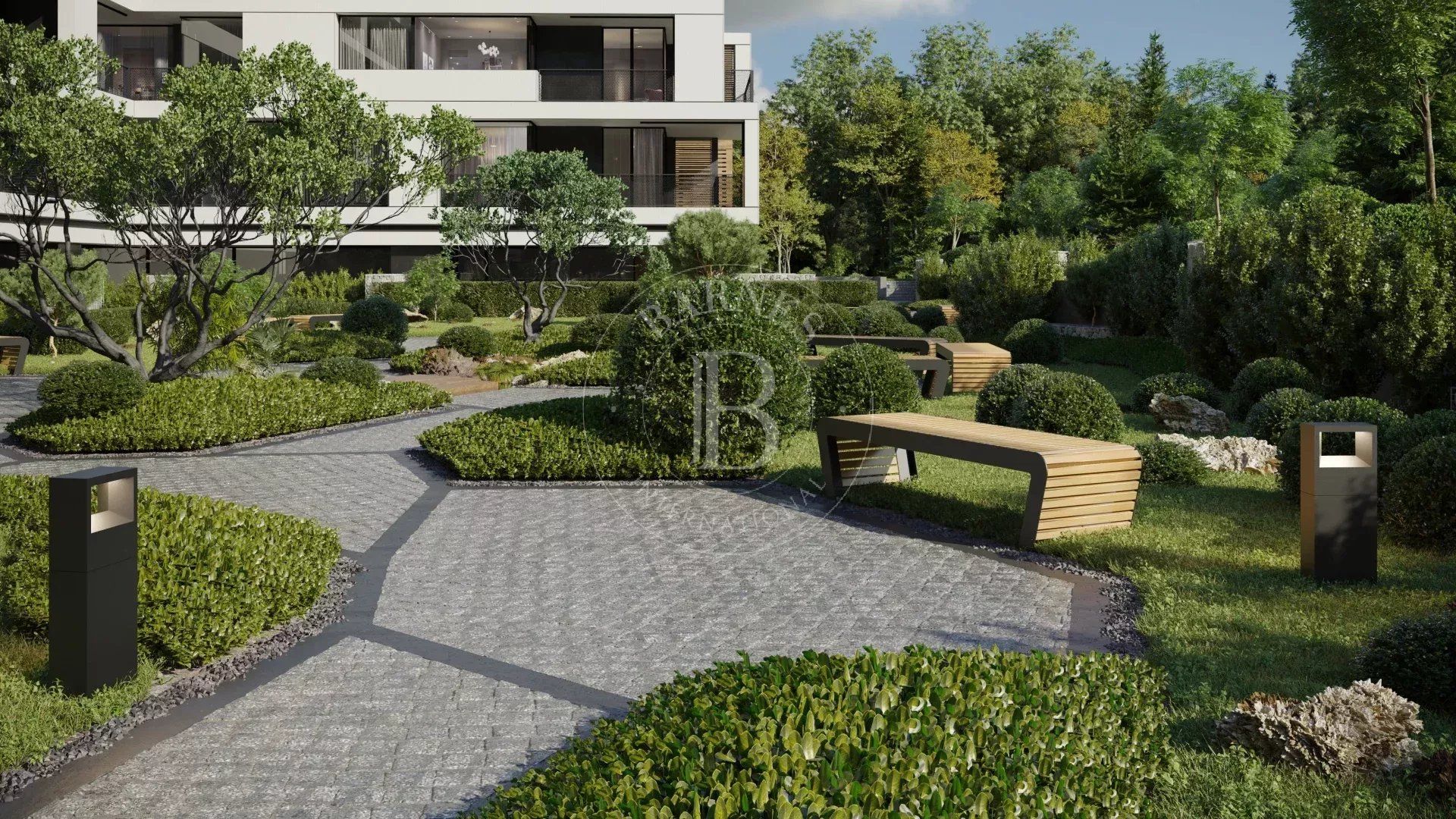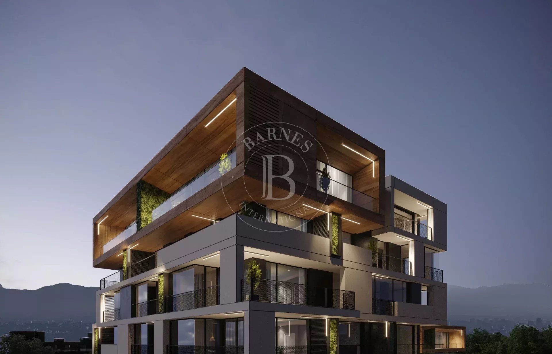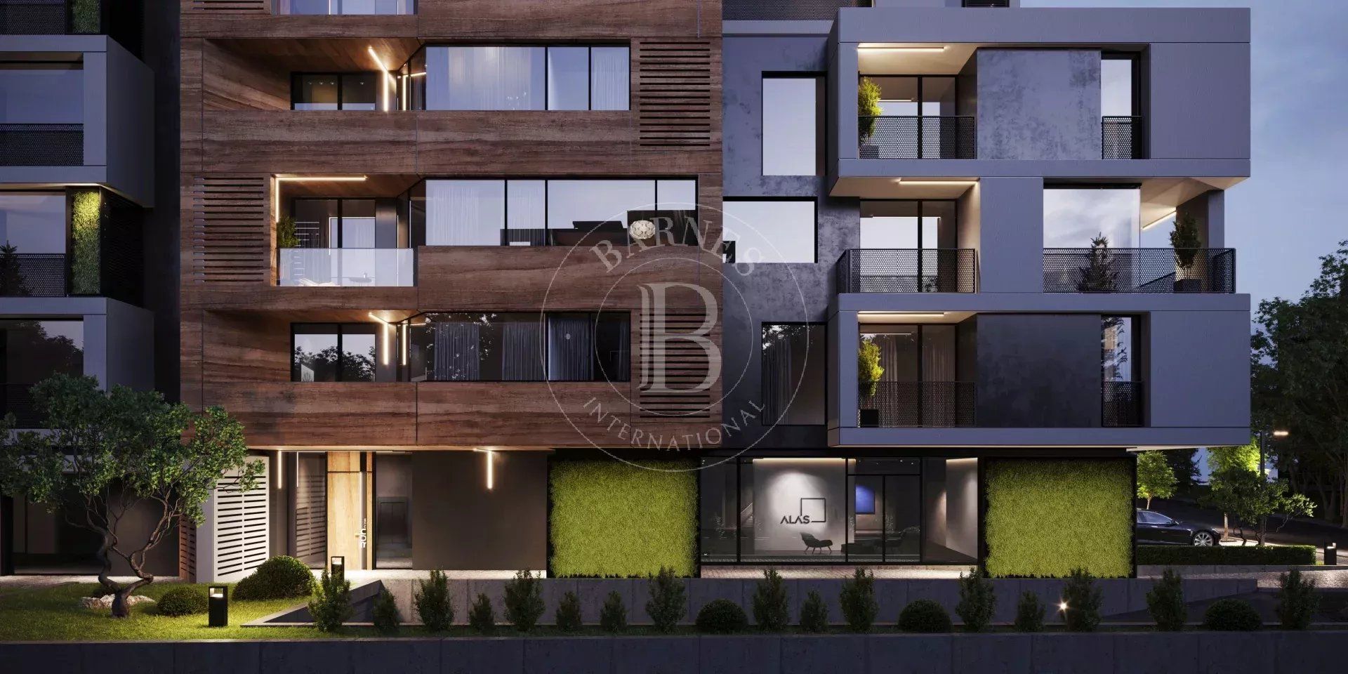 The sought-after play in the plasticity of protruding and recessed glass volumes in the overall façade is combined with a motif of vertical green walls, aesthetically concealing air conditioning units. All terraces, including those on the top floor, are designed to be covered in order to provide shade. The flooring of the terraces is a double floor type made of granite tiles. The openwork railings are available in two versions - glass triplex or with a metal frame with expanded metal mesh in black according to the architectural detail, following the compositional idea. The additional composition of the linear LED facade lighting is deliberately sought to emphasize the main idea at night. The idea of the dynamic composition is continued in the landscaping project of the main courtyard of the complex in combination with gabions, park furniture and lighting, and a water area.