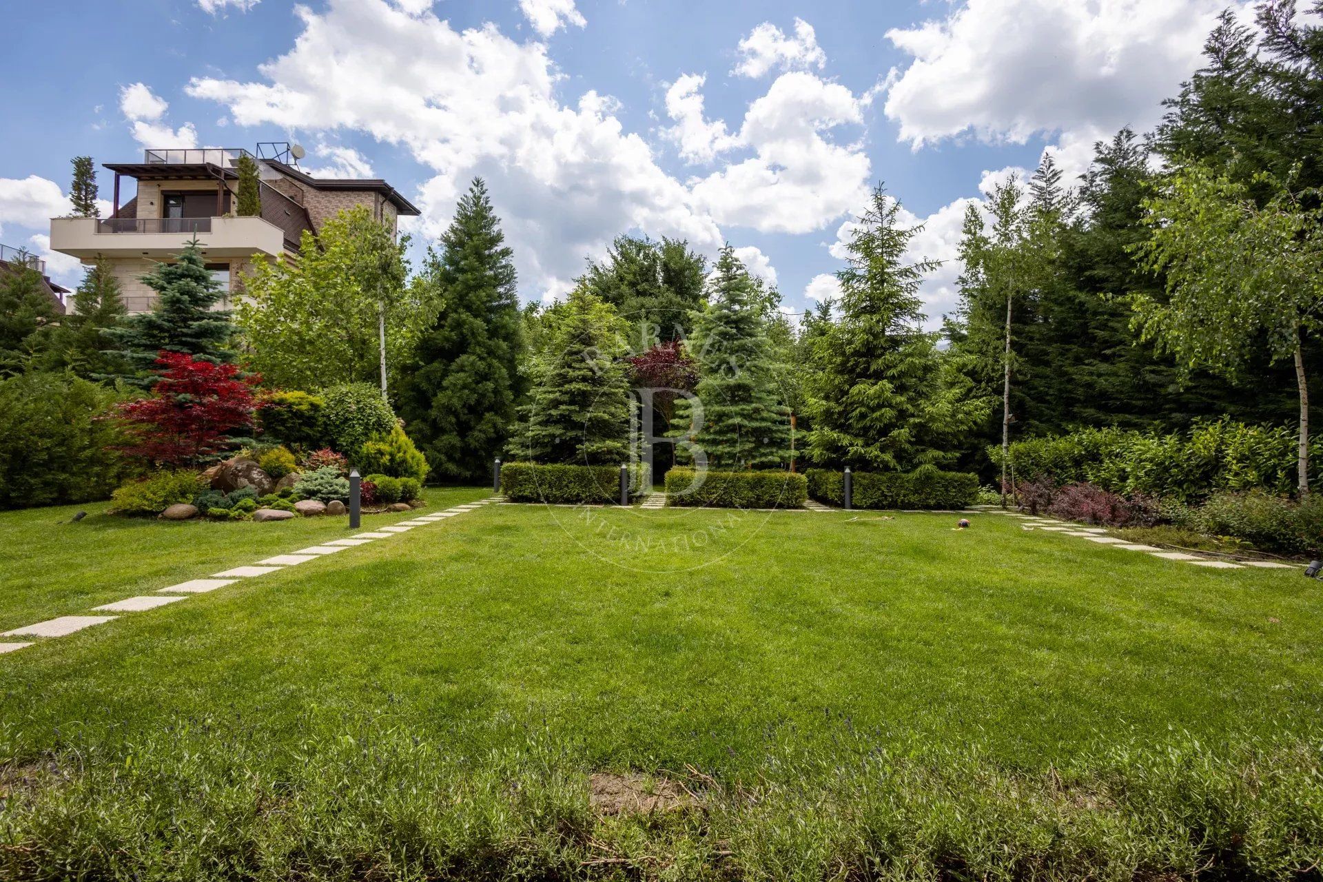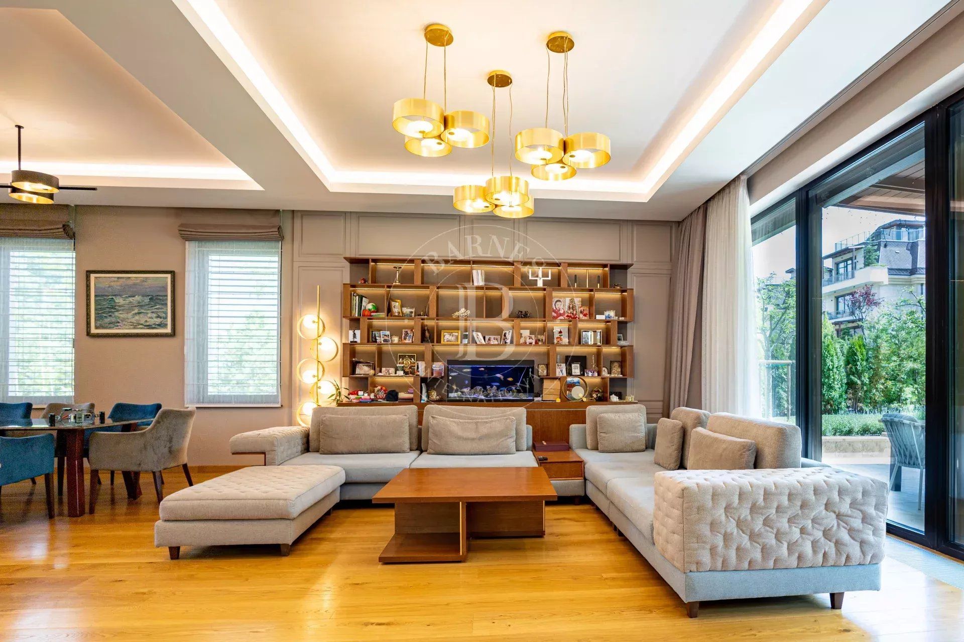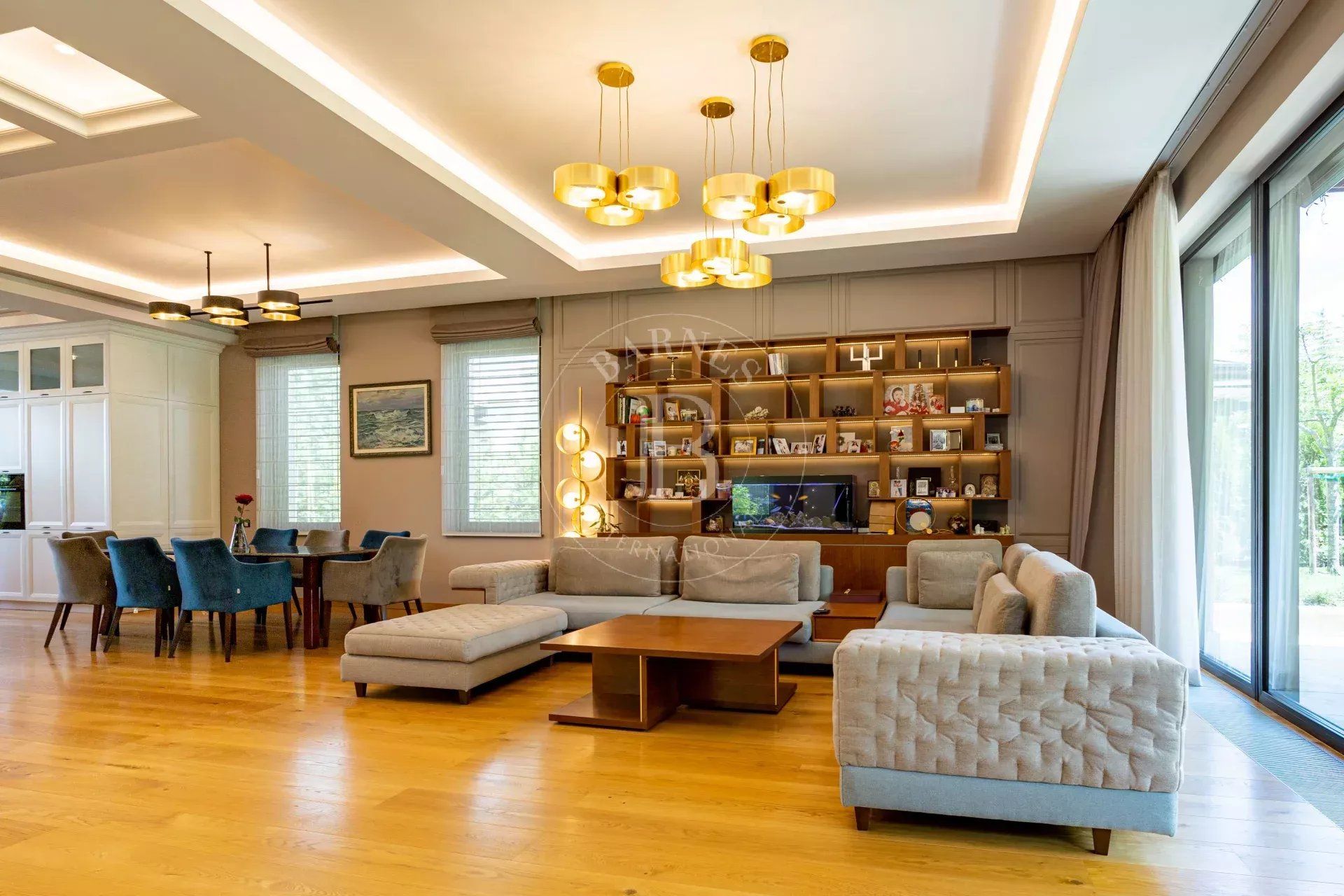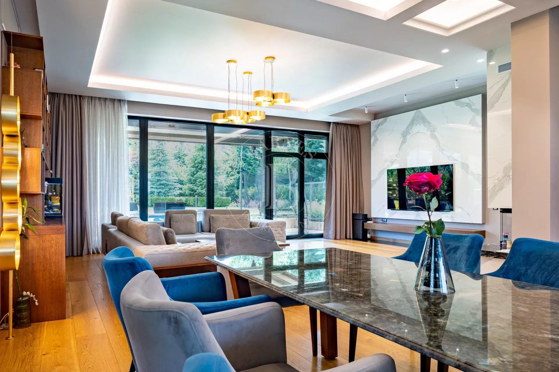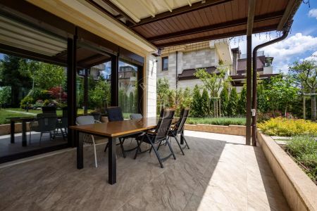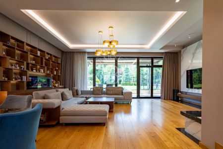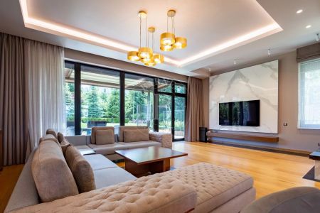 - Spacious and bright living room with fireplace and large panoramic windows overlooking the richly landscaped courtyard and beautiful veranda.
