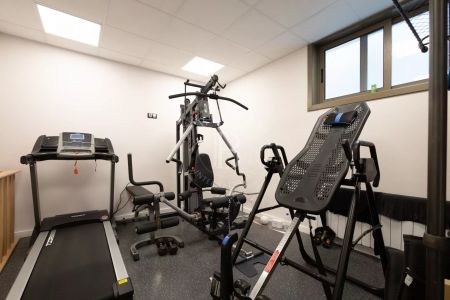 - Gym, sauna, steam room with salt, laundry room and hot connection to double garage;