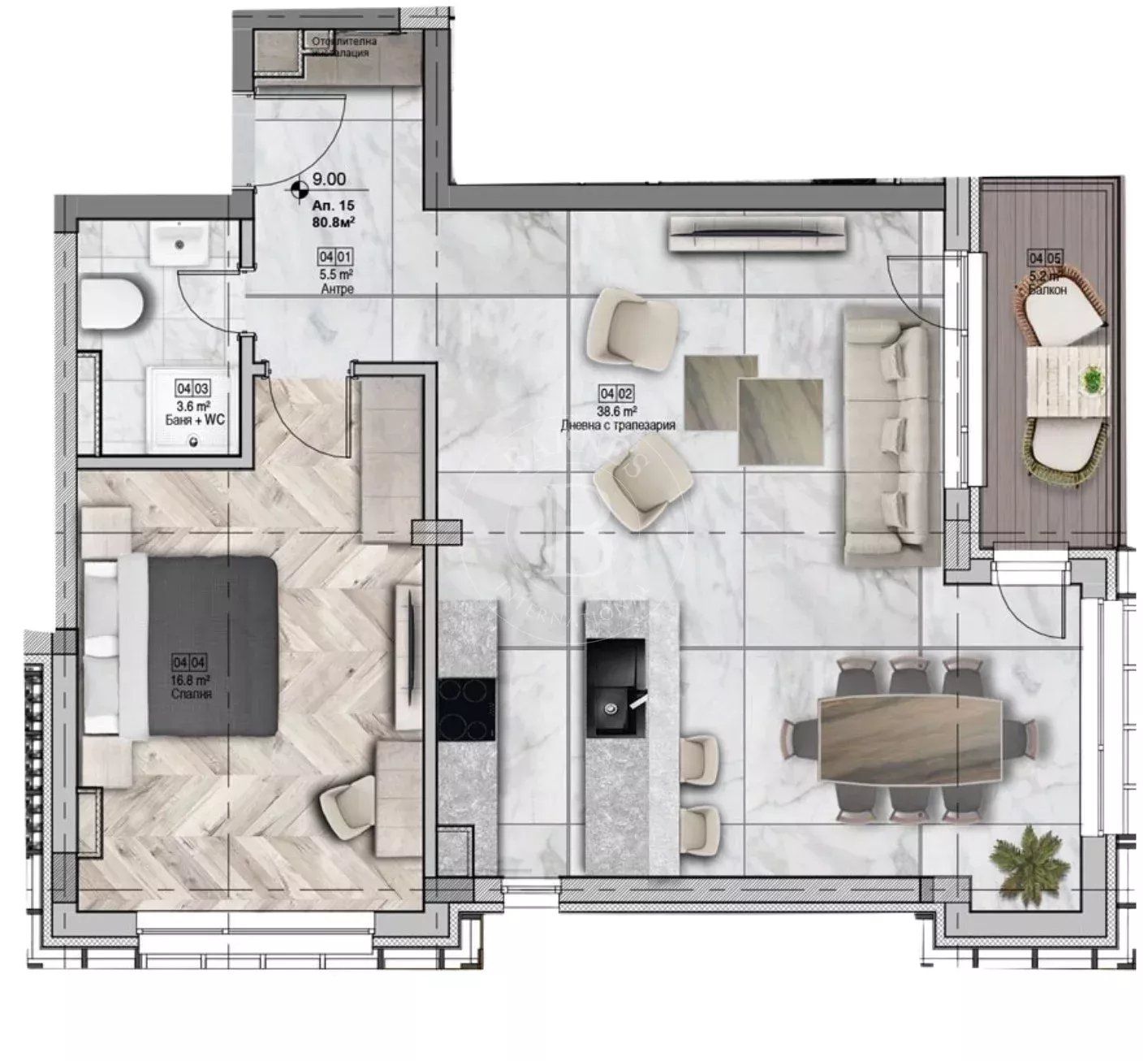The apartment has a net area of 81.10 sq.m. The ceiling height is 2.80 m. The windows are aluminum with triple glazing. The layout is well organized and creates a comfortable feeling of space: