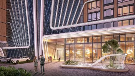 Проектирана е с динамични вертикални и диагонални линии, които създават усещане за движение и енергия. Това придава изключително съвременен и "жив" характер на сградата. Комбинацията от материалите носи хармония между футуристична визия и естествена топлина. Входът е внушителен, с големи витрини и светлинни акценти, а интегрираното LED осветление по контурите на фасадата не само подчертава архитектурната форма, но и създава ефект на блясък и престиж, особено през нощта. То превръща сградата в своеобразен градски ориентир.