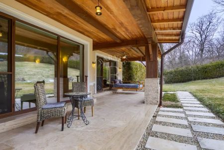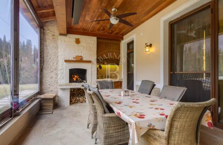 От дневната зона има директен излаз към просторна веранда, където е оформен цялостен кът с камина, барбекю и мивка, осигуряващи допълнително удобство и възможност за пълноценен отдих на открито.