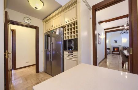 • Кухнята е самостоятелно обособена и функционално организирана, оборудвана с висок клас мебели и електроуреди: хладилник LIEBHERR, миялна машина Siemens, печка Siemens, фурна Siemens, аспиратор, вградена микровълнова, както и смесители и мивка. Кухненският плот е от естествен камък, а кухненският остров допълва удобството и модерната визия.