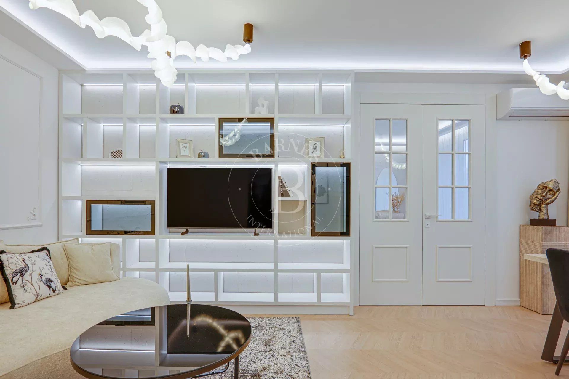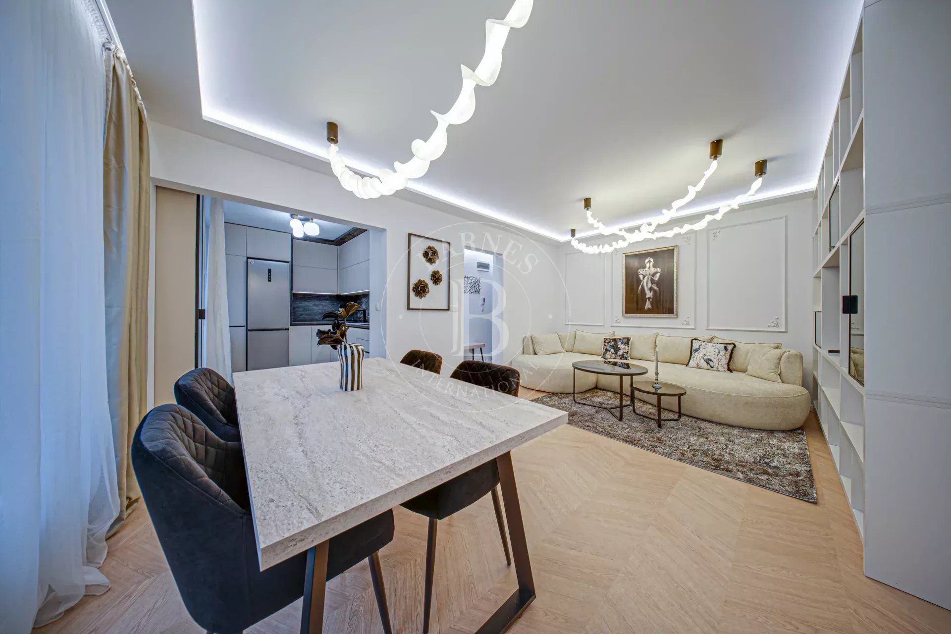 Апартаментът впечатлява с функционално разпределение, дизайнерски мебели и изчистени линии, които съчетават комфорт и модерна естетика.