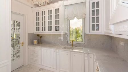 След представителен вход Ви посреща просторен хол. Дневната и кухнята в имота са тип Open space, с обособени кътове за трапезария, почивка и камина. На юг дневната се отваря изцяло към верандата през голяма витрина, уникално преходно пространство идеално за романтични вечери. От верандата има пряк излаз към басейна, ситуиран централно в градината и облицован изцяло с естествен мрамор Pyrgos Light.