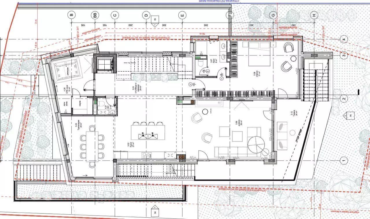 • ниво сутерен (-1) – гараж с възможност за паркиране на четири автомобила, пространство за фитнес и обслужващи помещения;