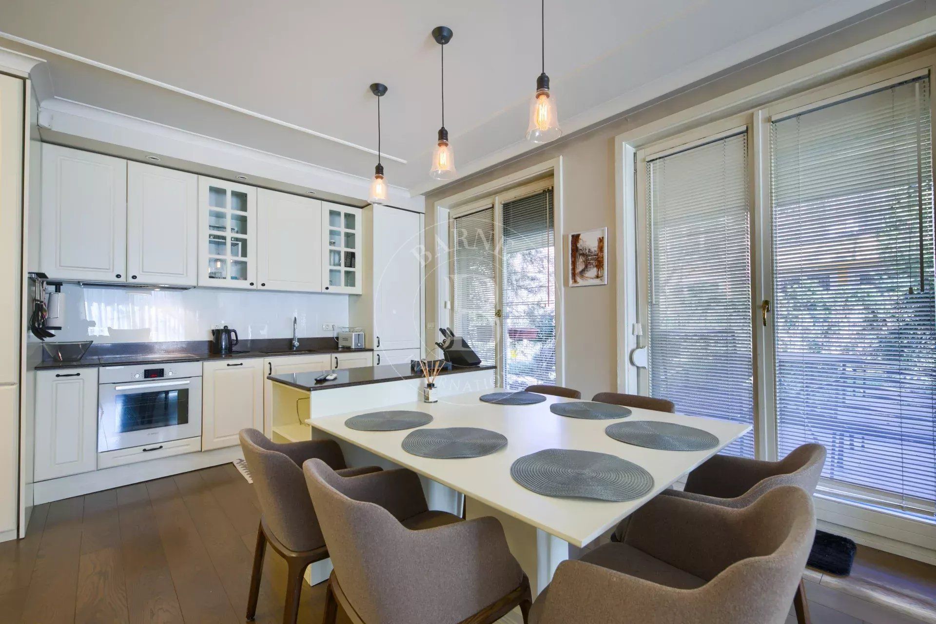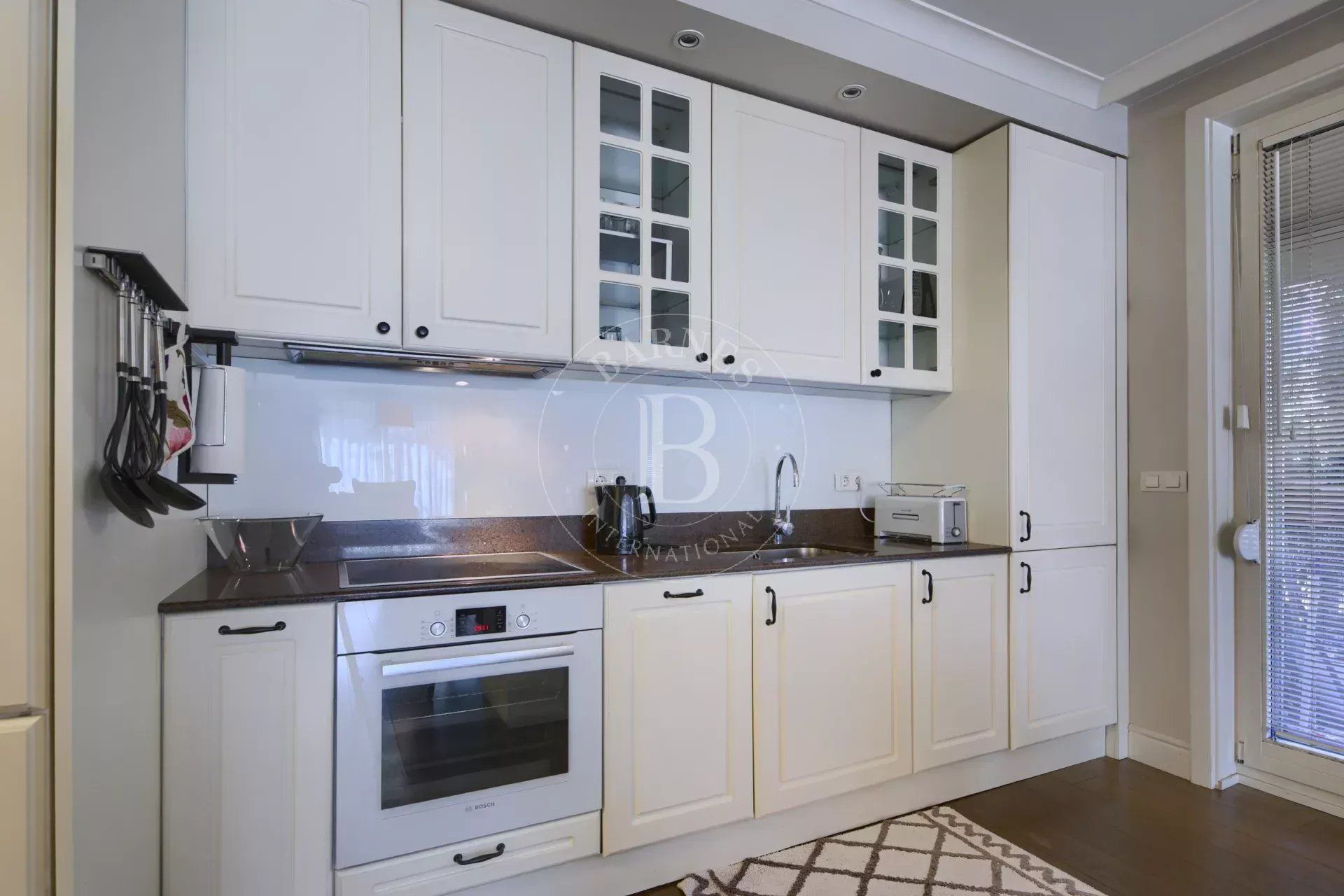 Жилището е обзаведено и поддържано в много добро състояние, с практично разпределение и достатъчно място за съхранение. Дневната е организирана като open plan пространство с кухня, трапезария и зона за почивка, с кухненски остров и директен излаз към двора.