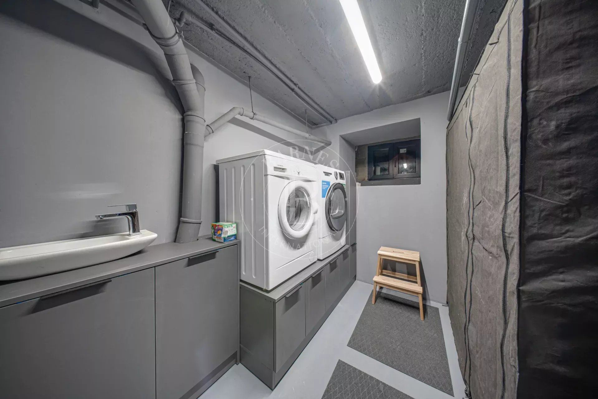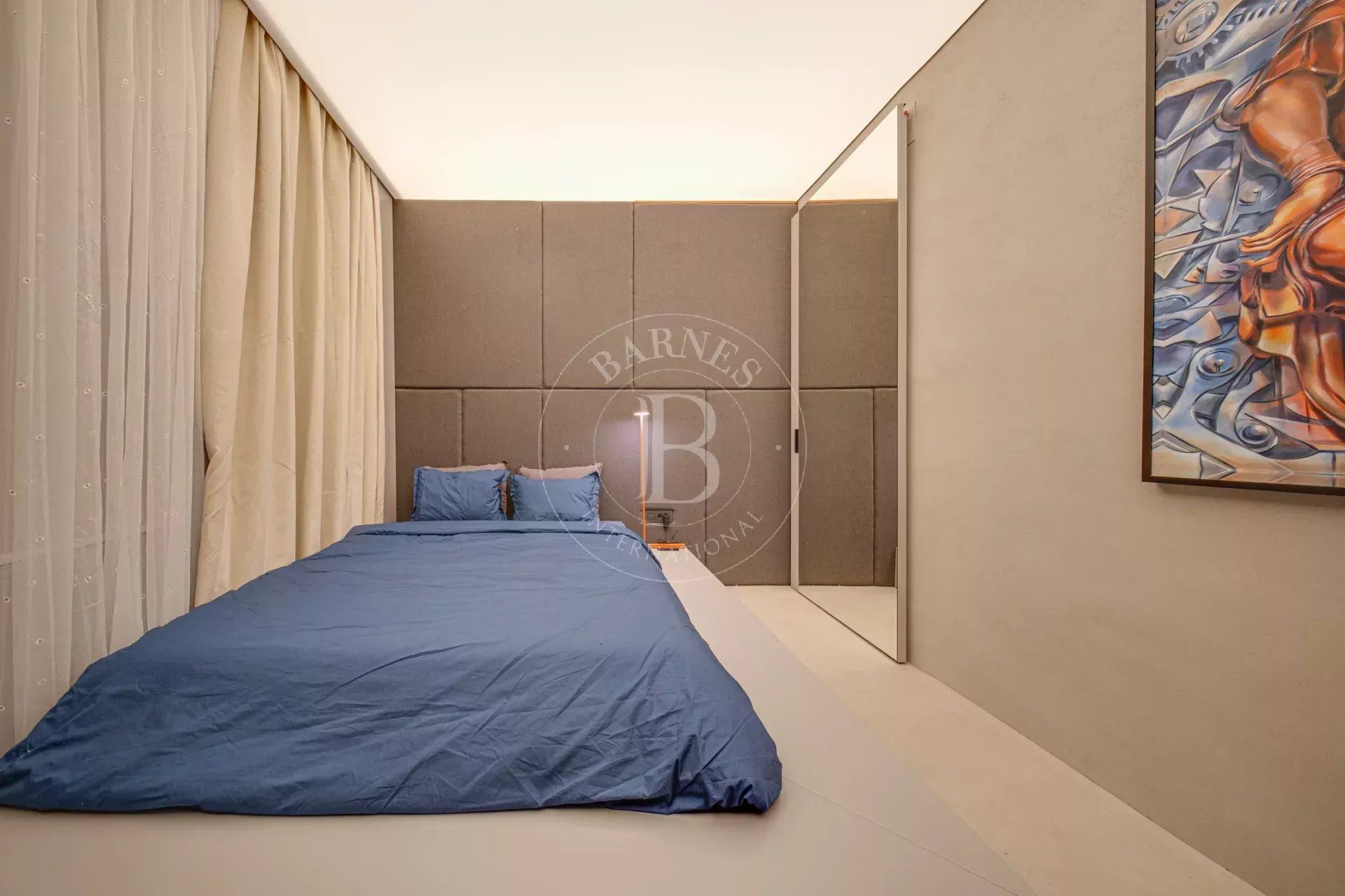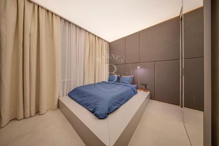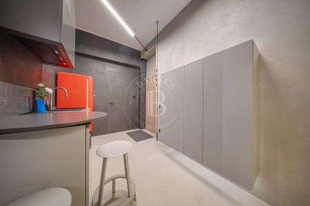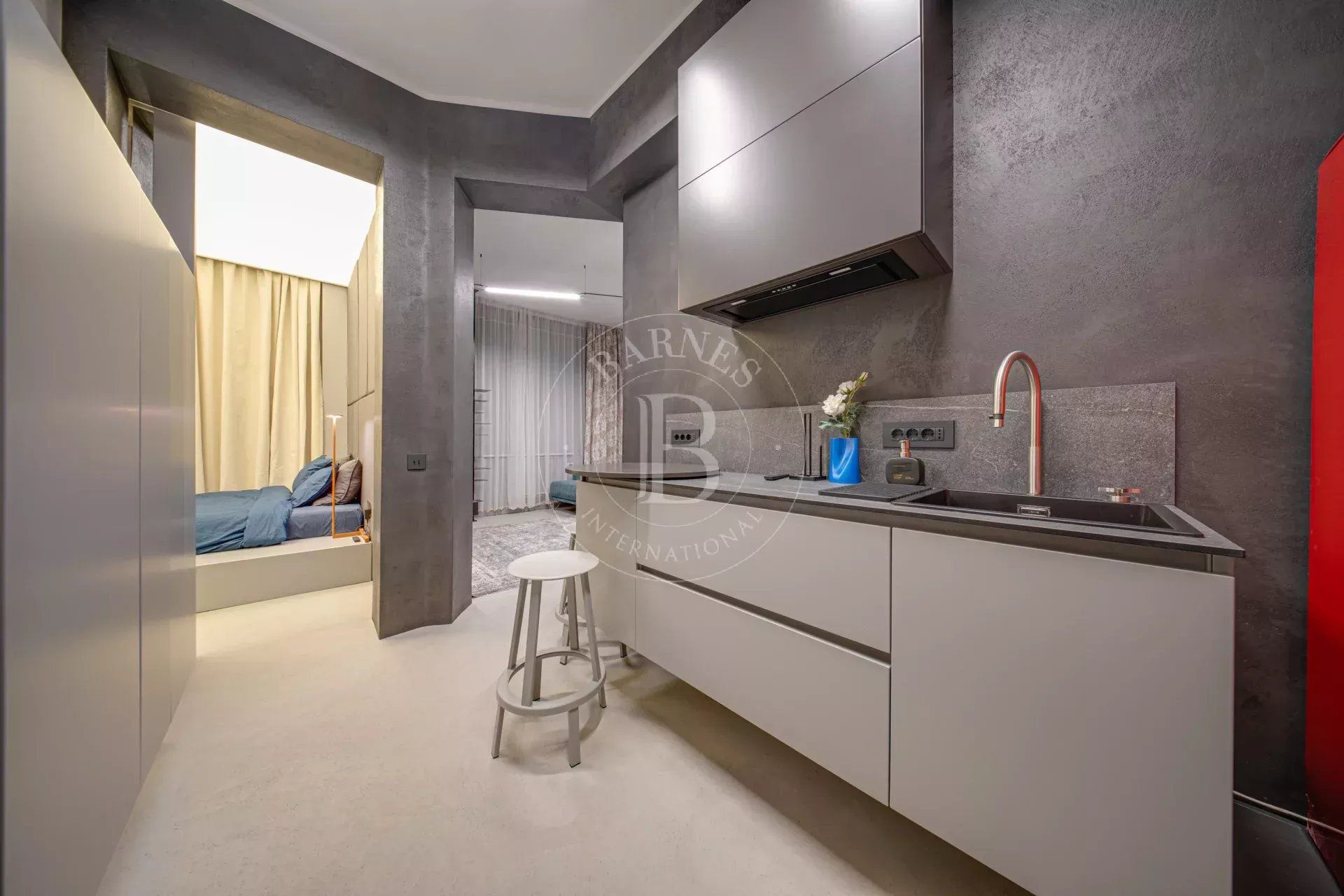 Обзавеждането е селектирано с внимание към комфорта и визуалната цялост — диван Gautier с електрическа функция, дизайнерски шкаф в дневната, ретро хладилник Smeg, копринен килим и специално изработена плъзгаща врата за спалнята.
