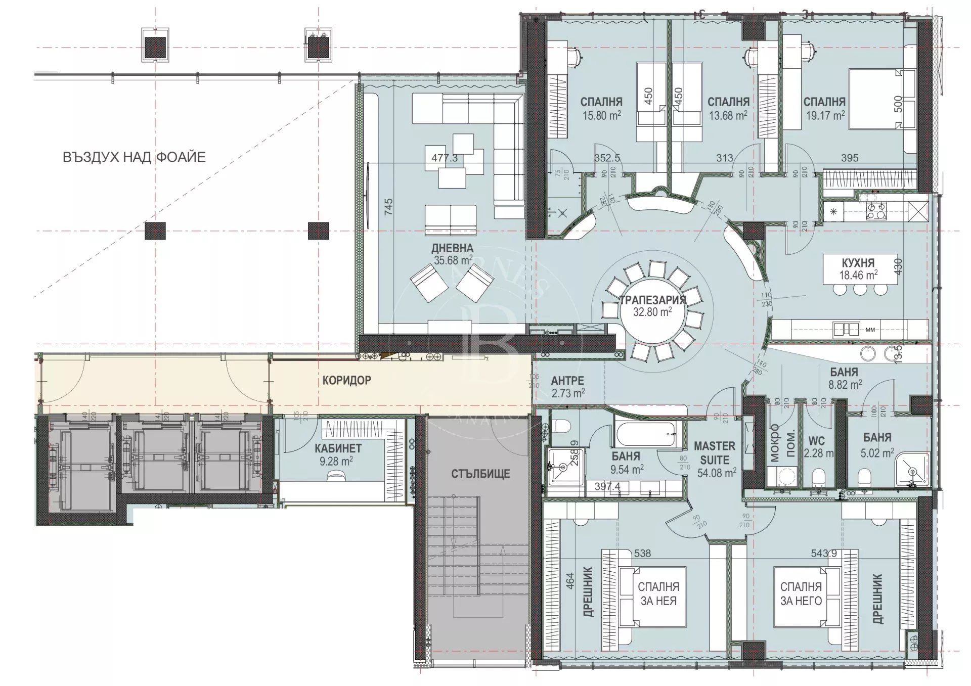 Общата му площ от 308 кв.м и чиста площ от 280.60 кв.м са проектирани така, че да осигури максимална функционалност, комфорт и хармония във всяко пространство.
