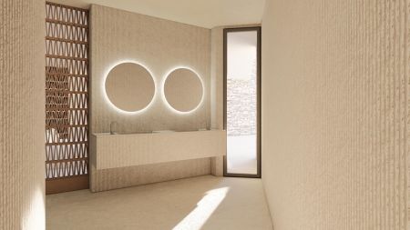 Разположена върху парцел от 13 658 кв.м., тази впечатляваща резиденция в пещерен стил с обща площ от 617 кв.м. е архитектурно бижу, което хармонично съчетава съвременния дизайн с цикладските елементи.