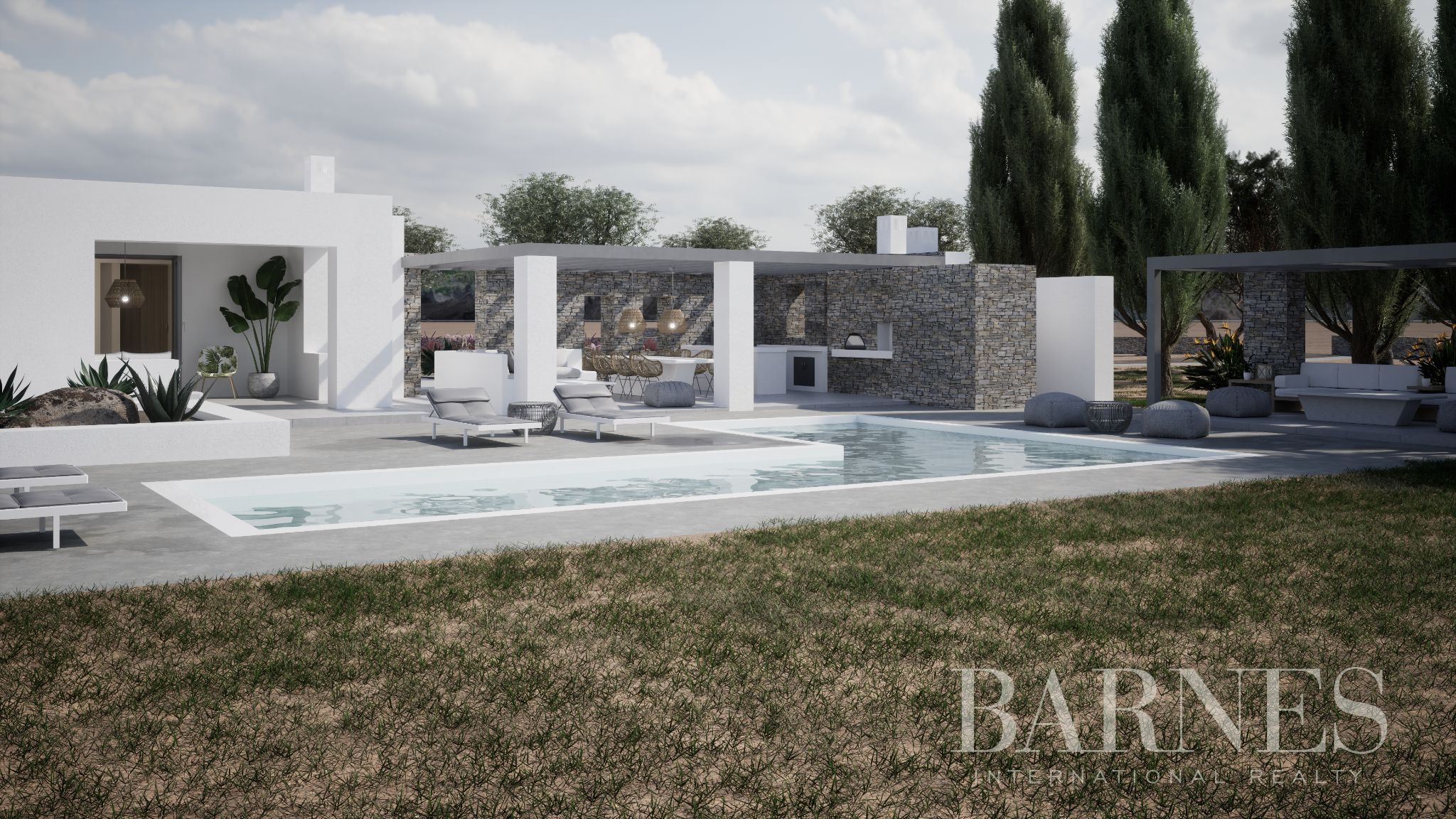 Външната площ предлага просторна градина с плувен басейн, зони за отдих, пергола, външна баня и душ за ползване на басейна.