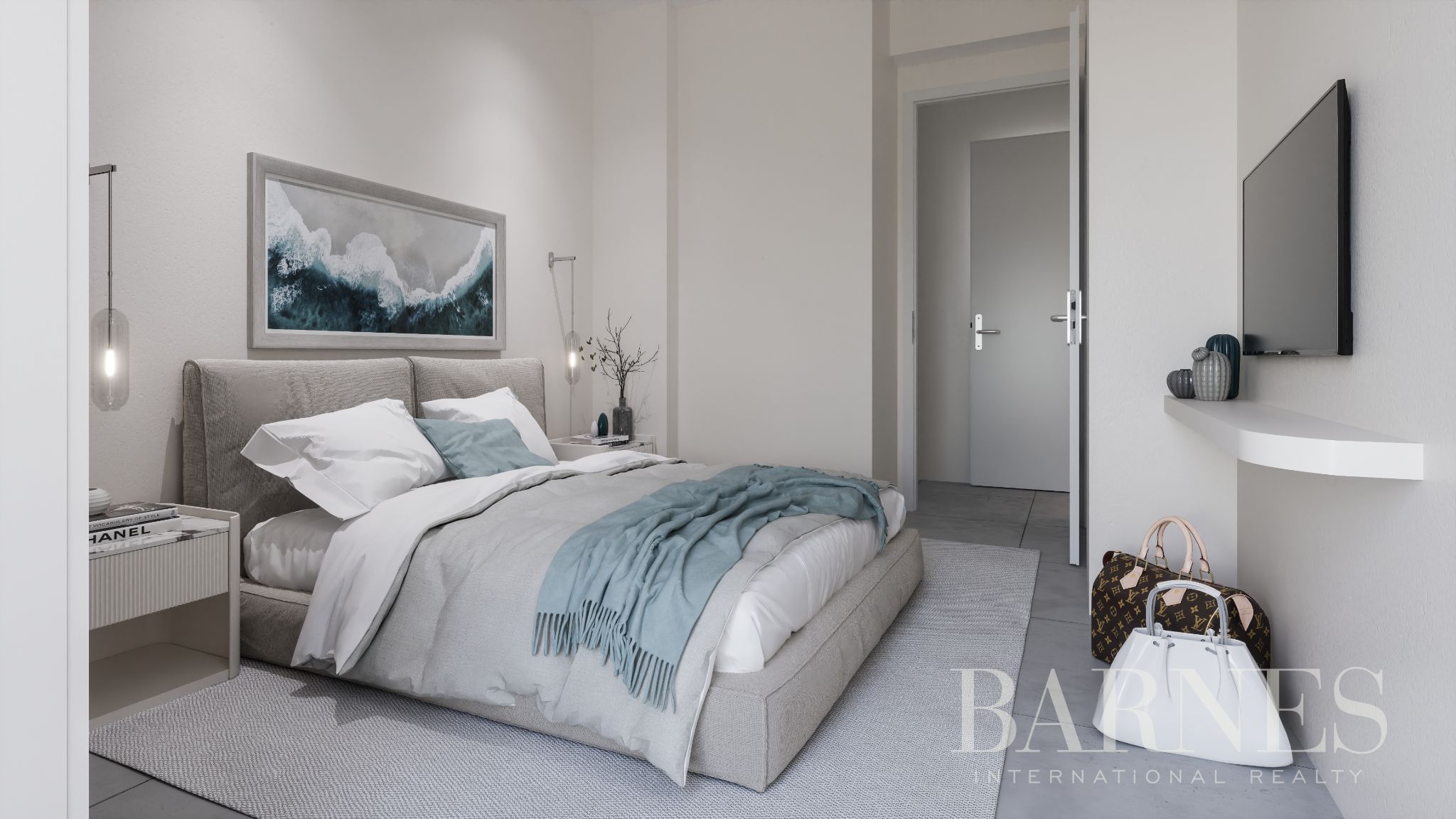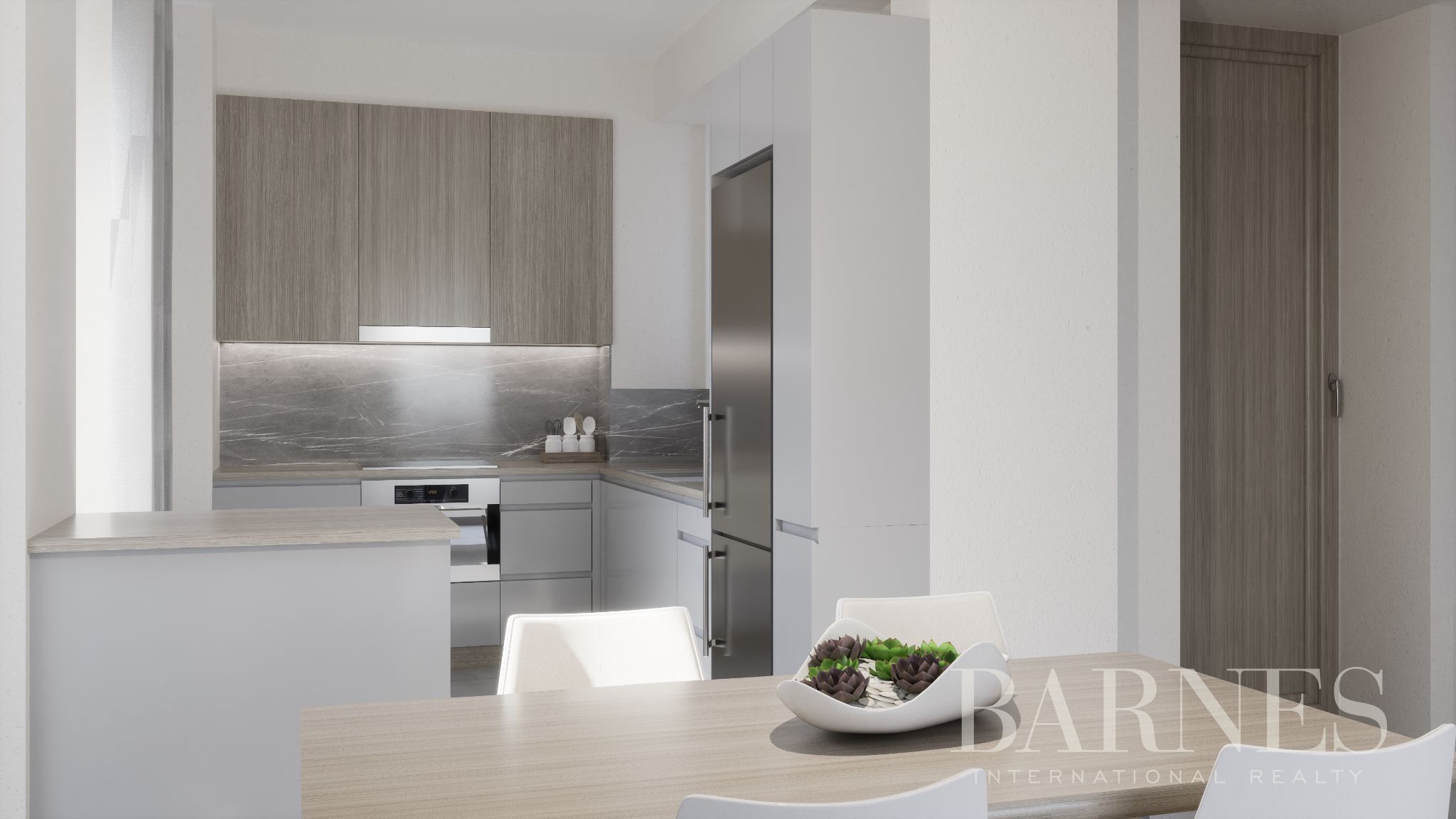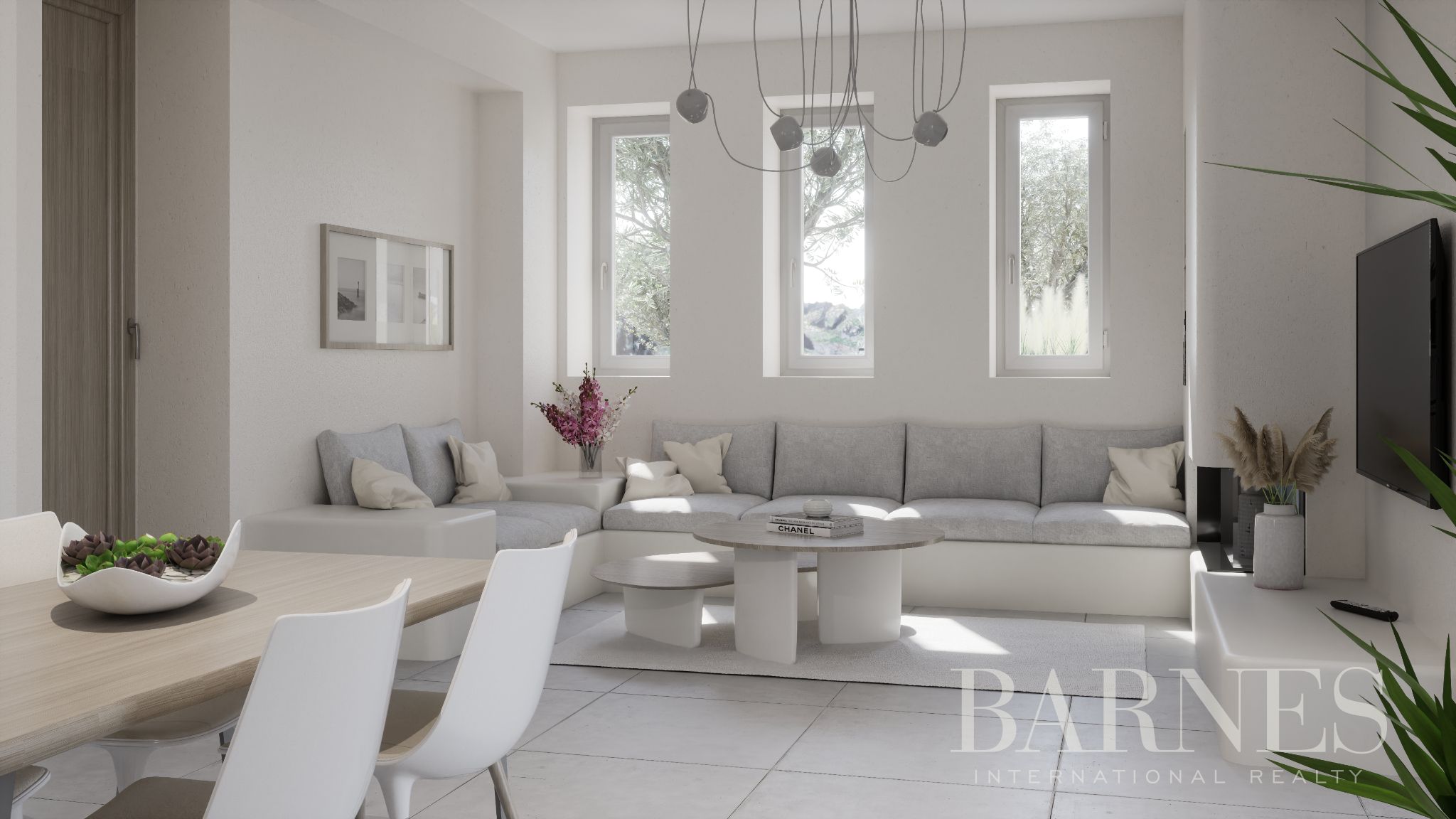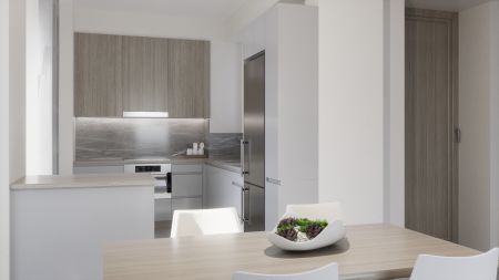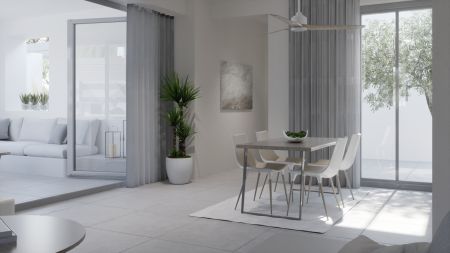 Разположен на едно ниво, той разполага с отворен план хол и трапезария с кухня, 3 спални, две от които със собствени бани, и 1 допълнителна обща баня.