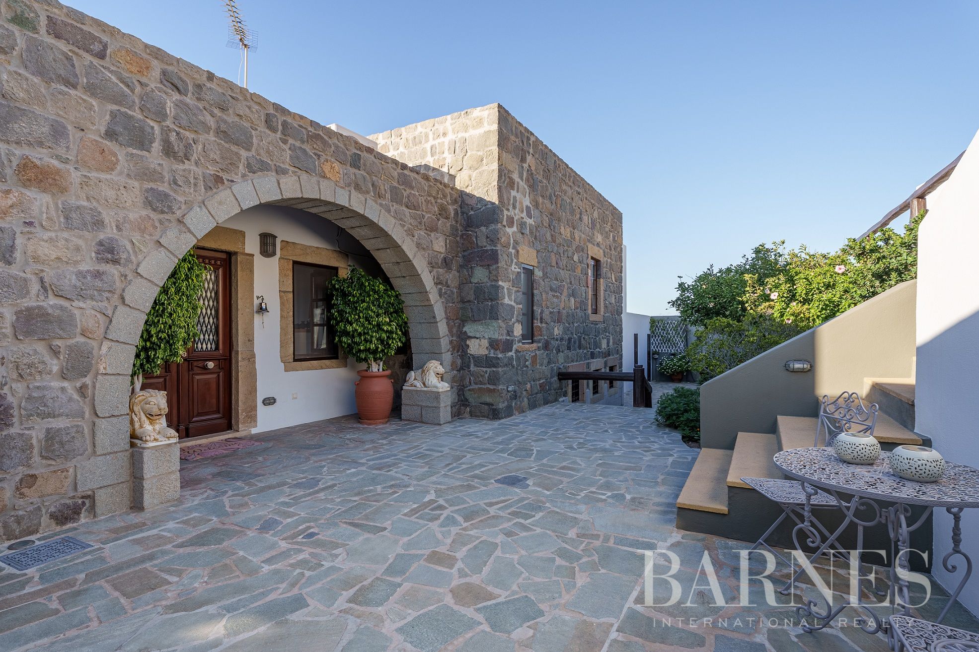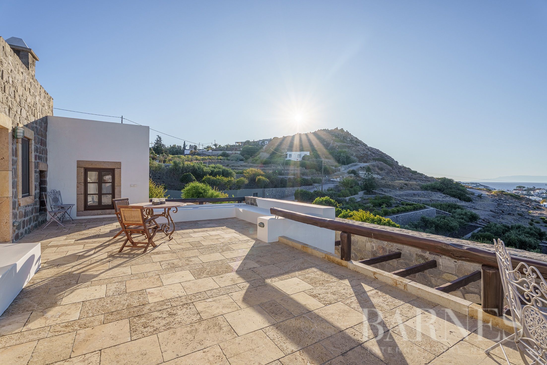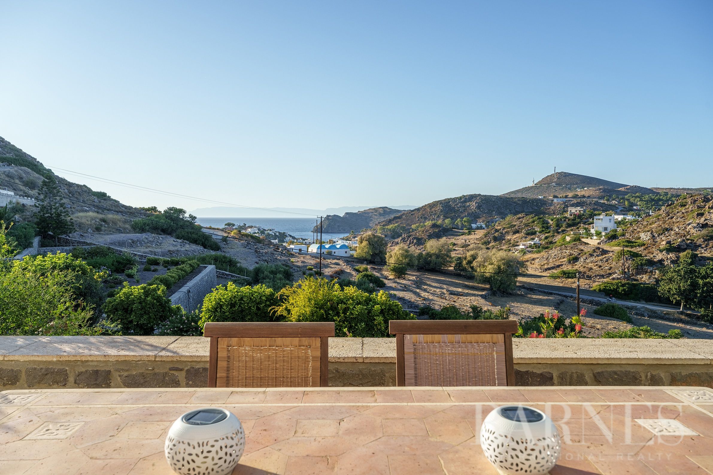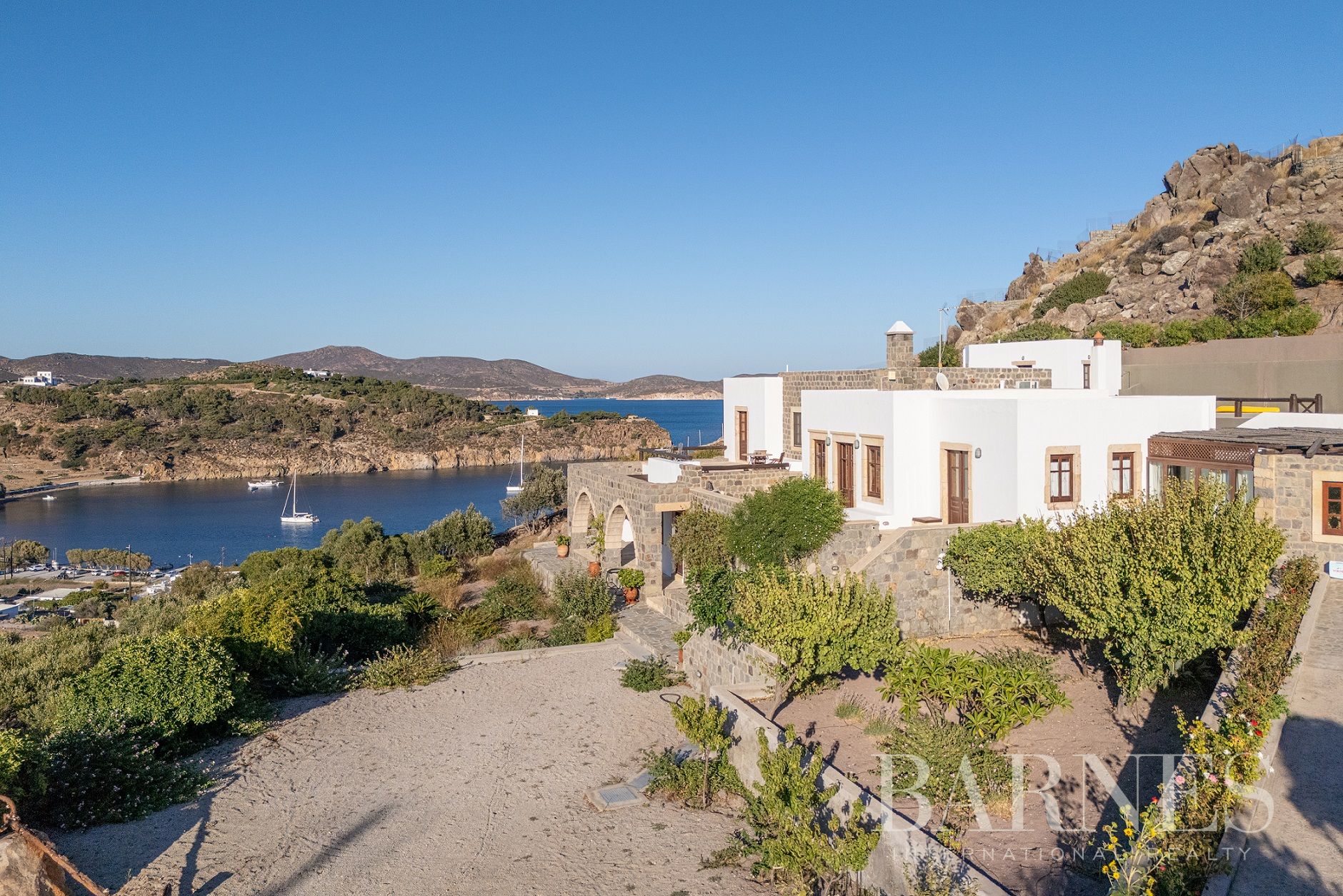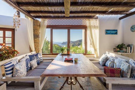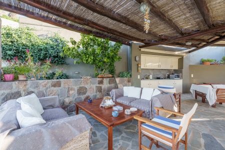 Имотът разполага и с външна кухня с кът за сядане и красиво озеленена градина с гледка към морето и зашеметяващия залез на Патмос.