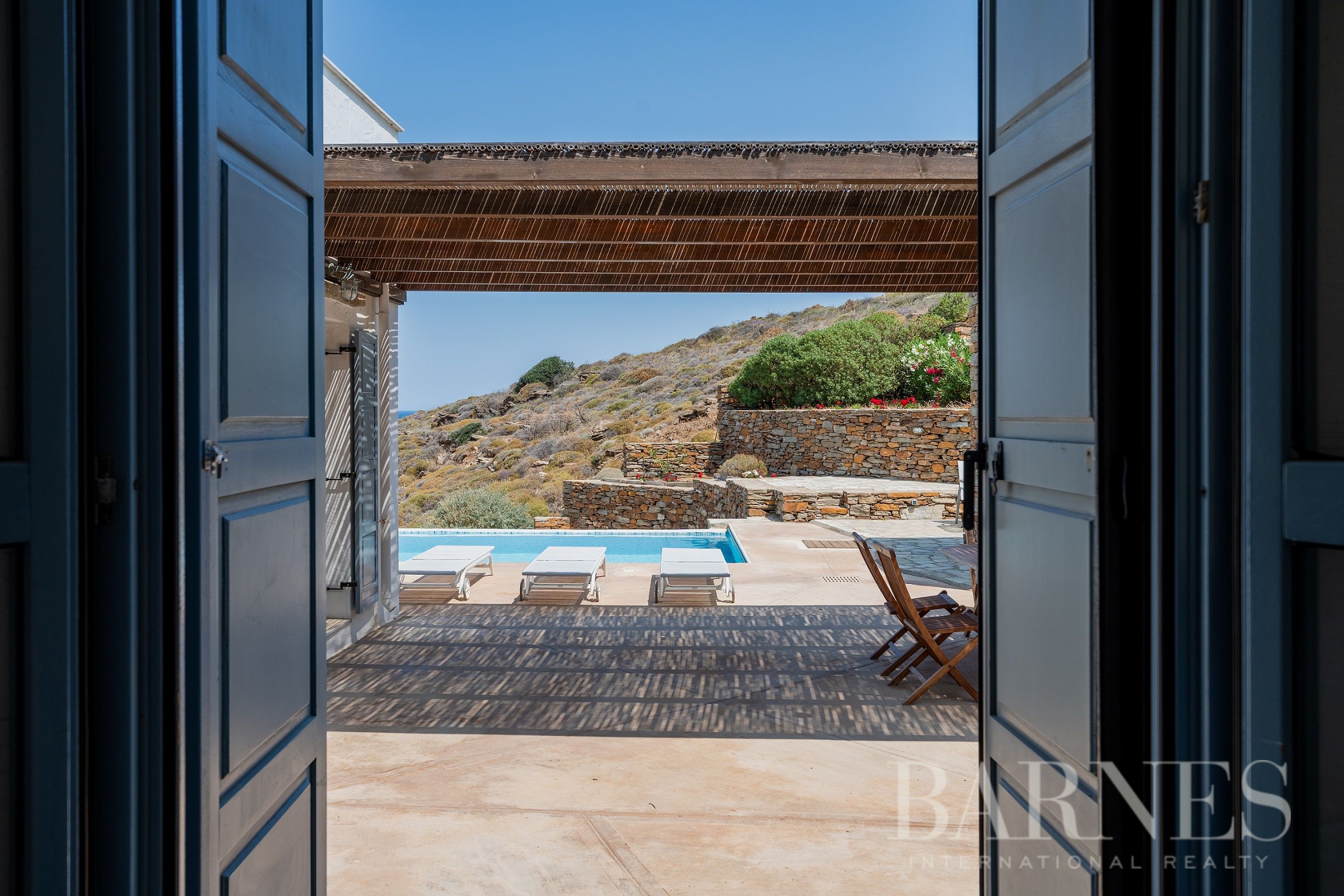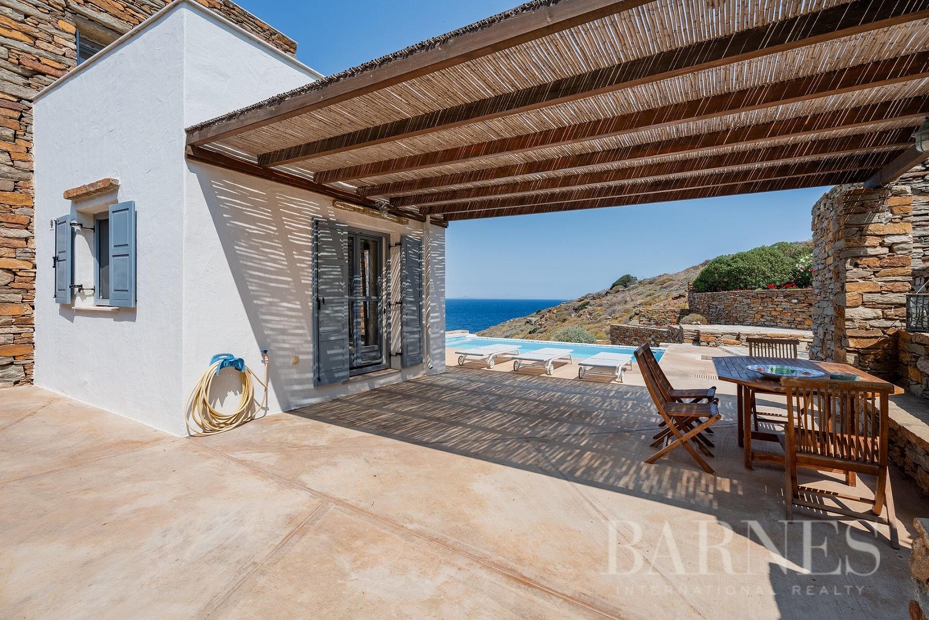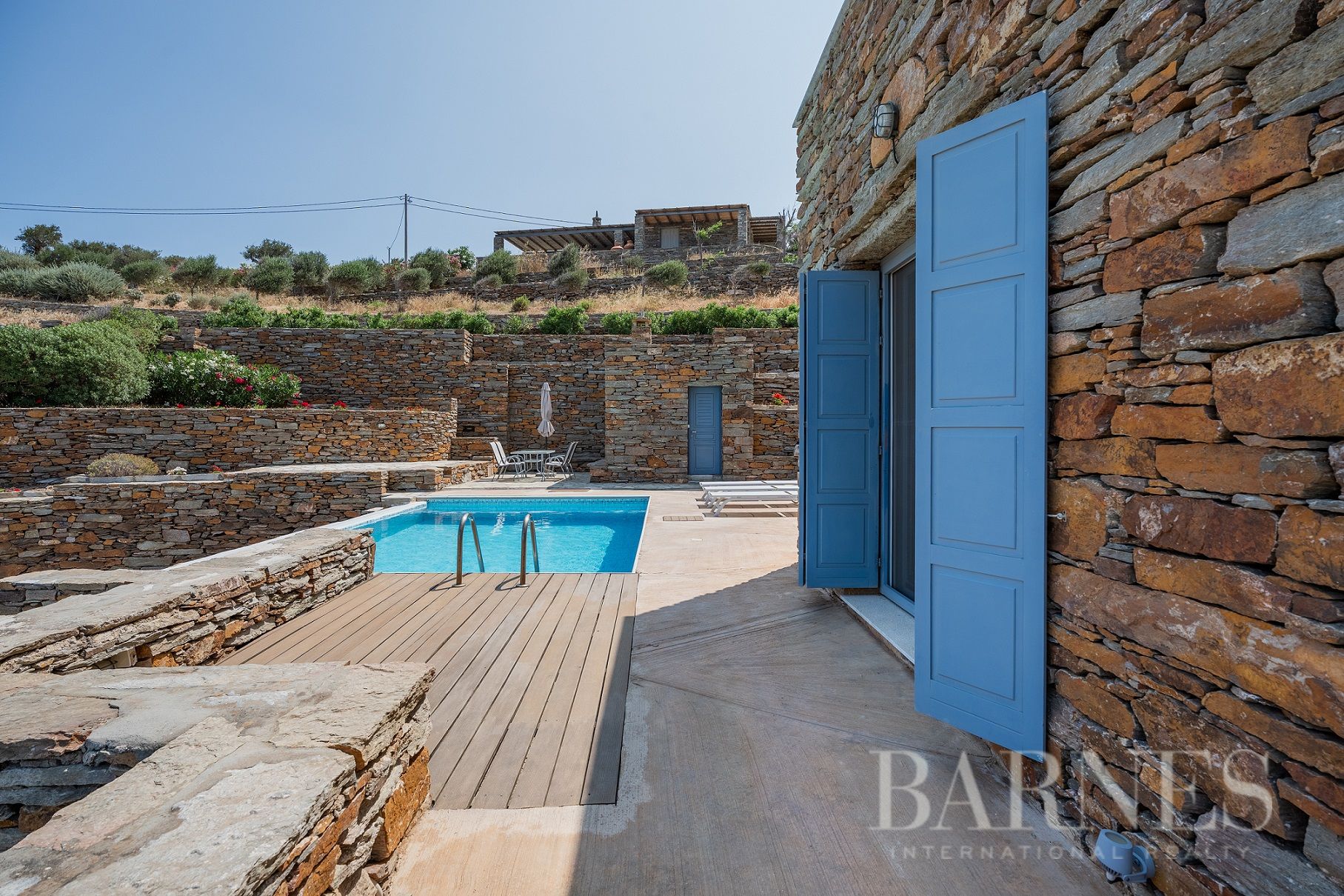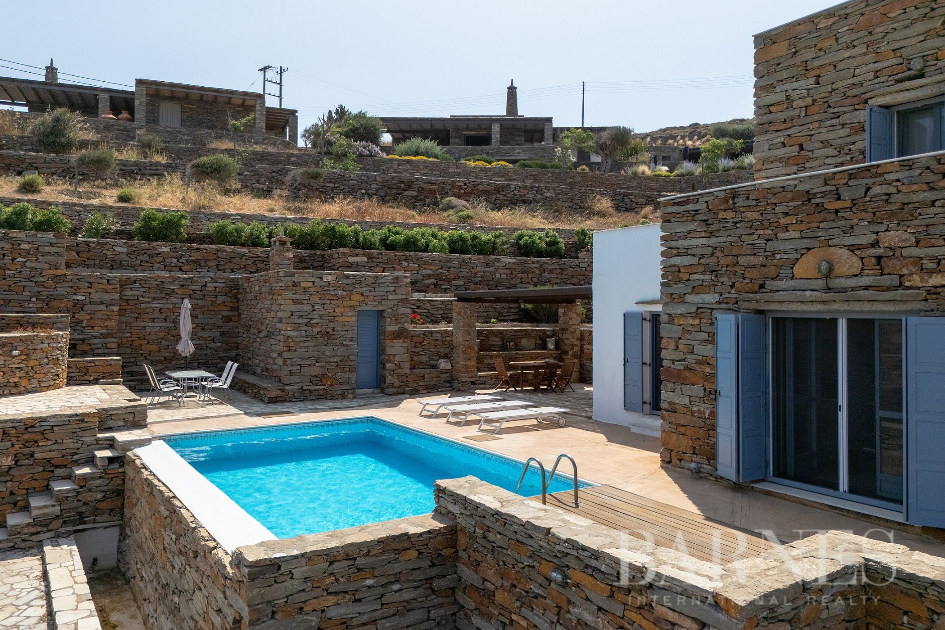 Добре поддържаната околна зона включва плувен басейн и просторни тераси с множество места за сядане.