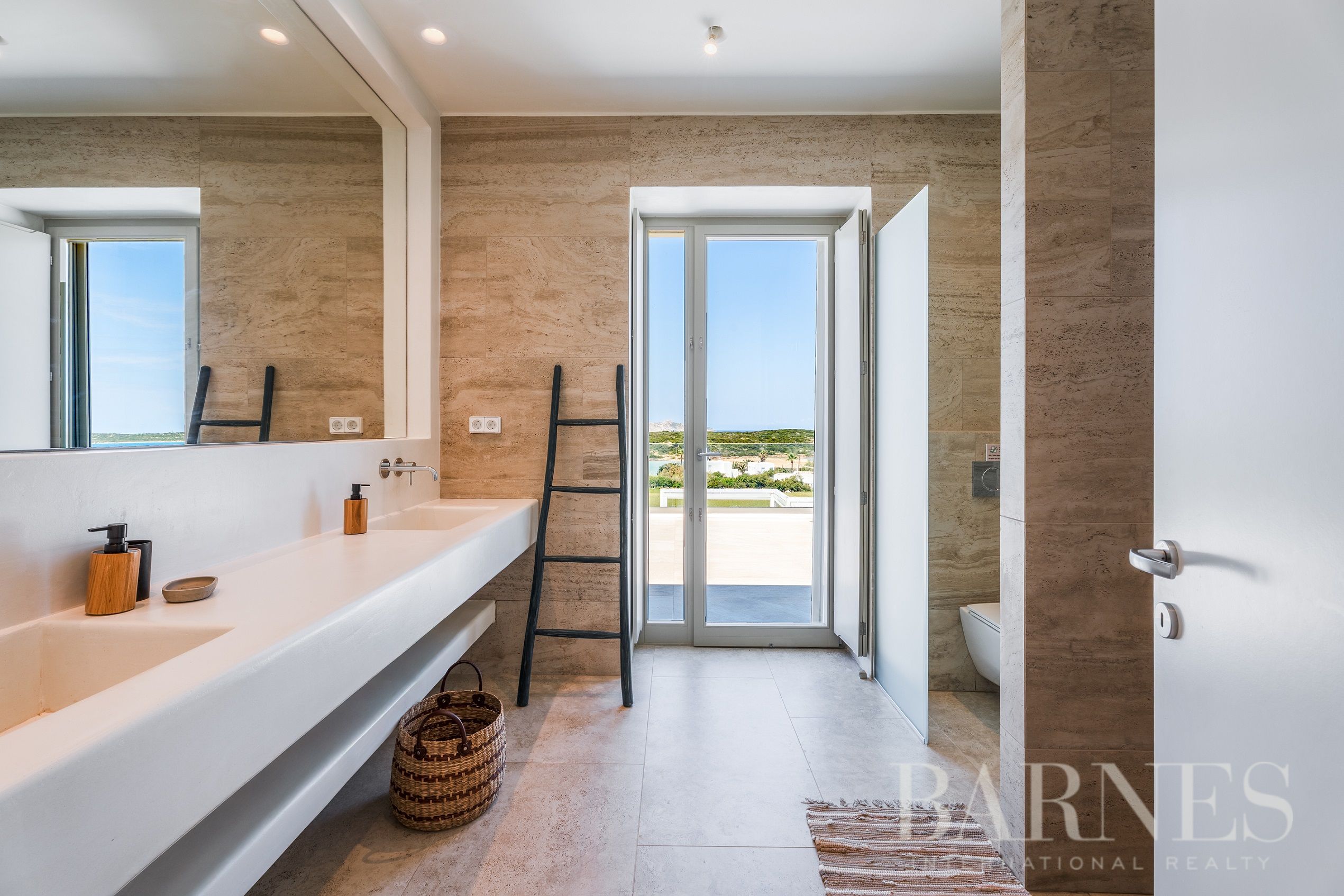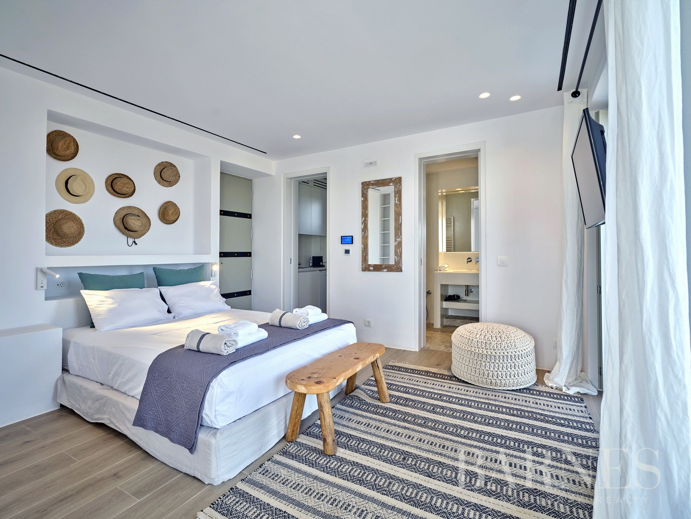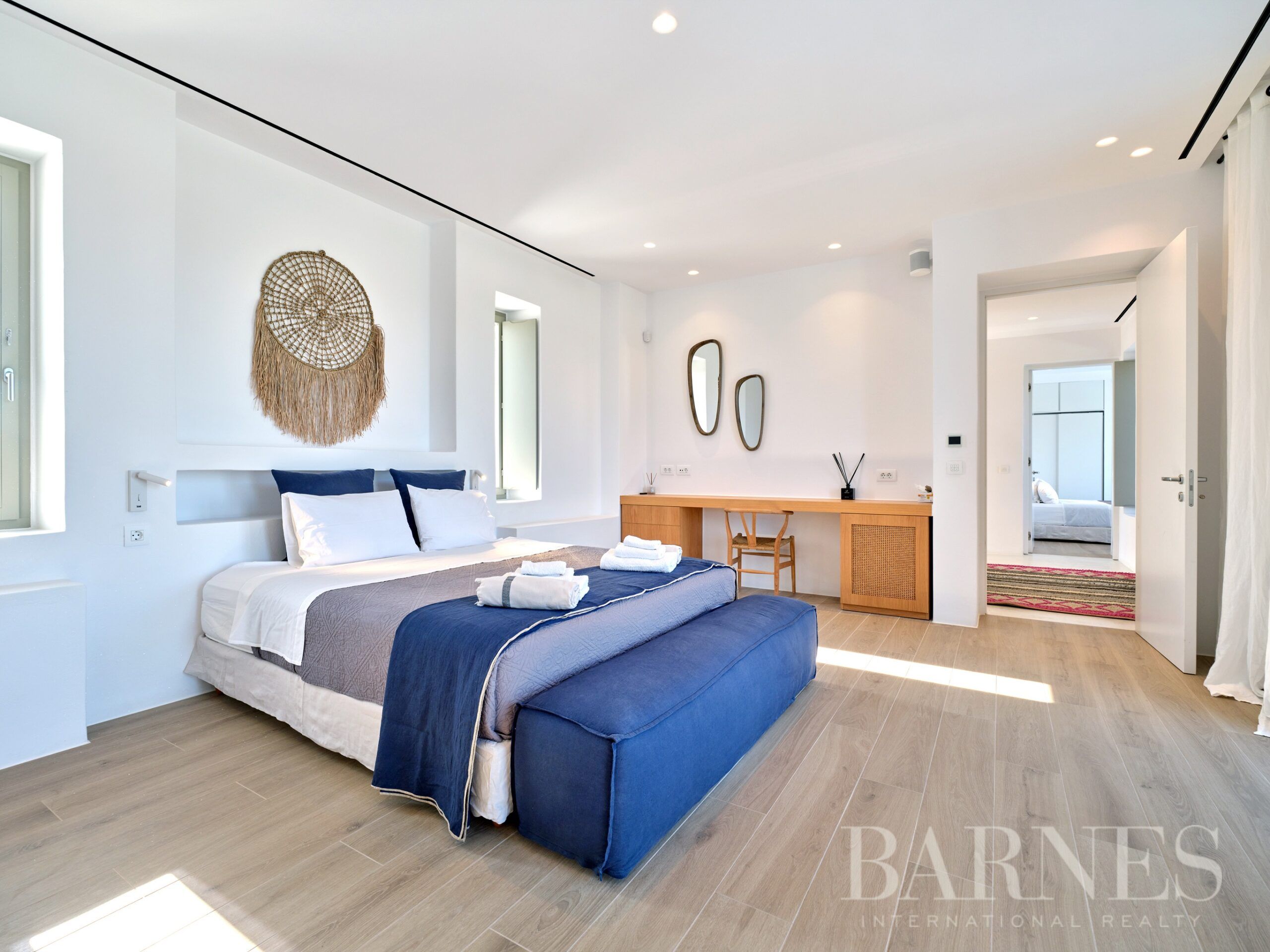 На горния етаж има 2 впечатляващи спални със самостоятелни бани и големи тераси, предлагащи панорамна гледка към Егейско море.
