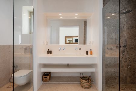 Построена върху парцел от 6200 кв.м., резиденцията се простира на общо 460 кв.м. и предлага изискани вътрешни и външни жилищни пространства.