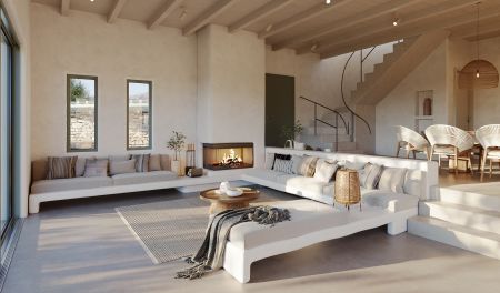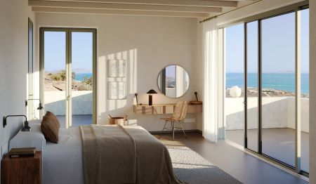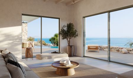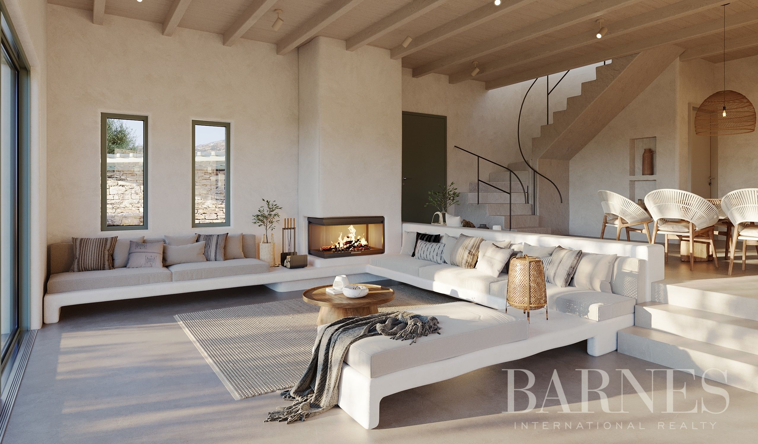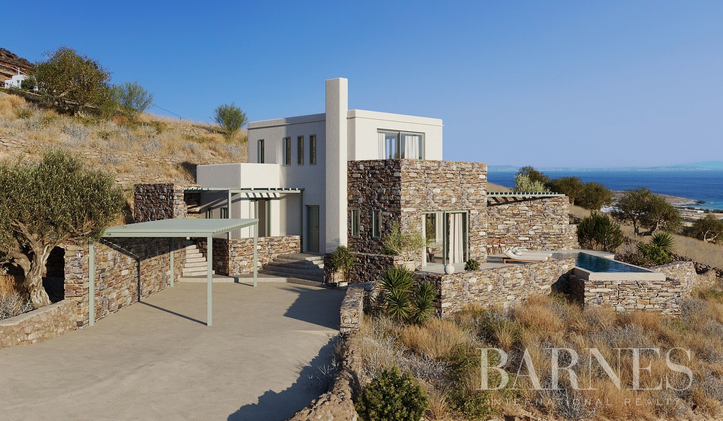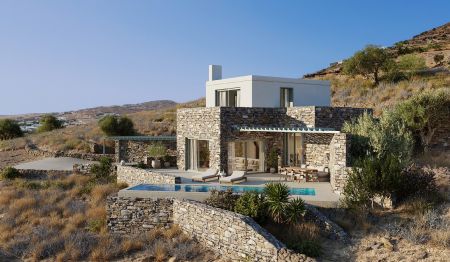 Тази очарователна вила в строеж се намира в спокойно място с панорамна гледка към залива Агиос Йоанис, предлагайки идеалния баланс между уединение и лесен достъп до някои от най-красивите плажове на Тинос.