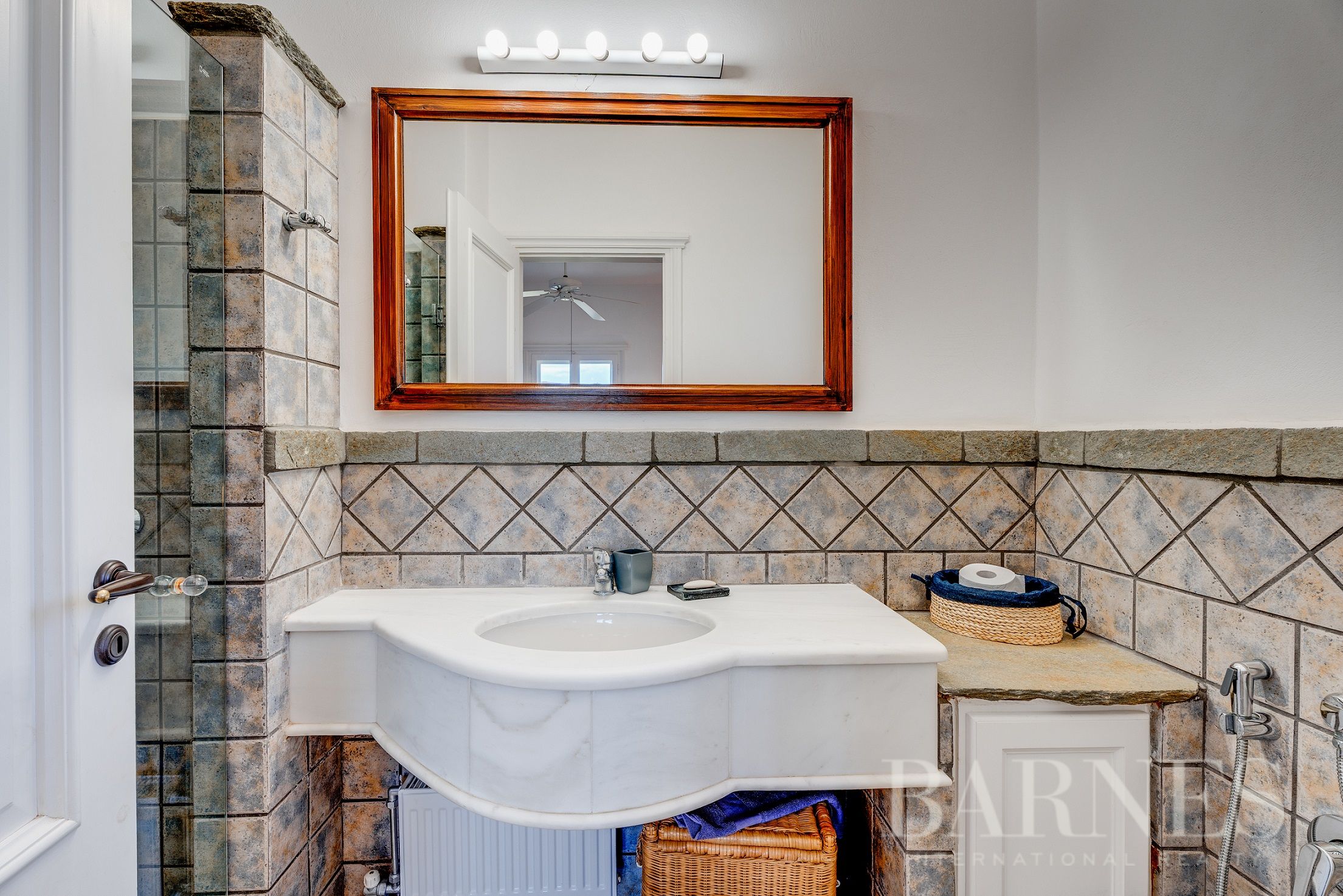 На приземния етаж има светла всекидневна и трапезария с камина, напълно оборудвана кухня и 4 спални, всяка със собствена баня.