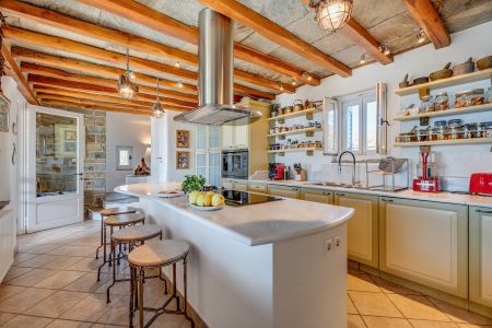 Външните площи са наистина впечатляващи, разполагащи с голям плувен басейн, пергола с барбекю и пещ на дърва, удобен кът за сядане за релаксиращи моменти край морето, красиво озеленена градина, паркинг и директен достъп до плажа.
