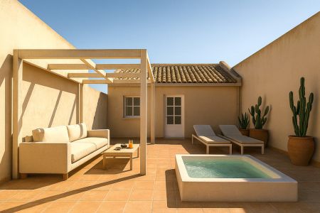 Предлага възможност за проектиране на до 6 спални, 4 бани, просторни приемни и дневни, кухня и покривна тераса с пергола и гледка към града и морето.