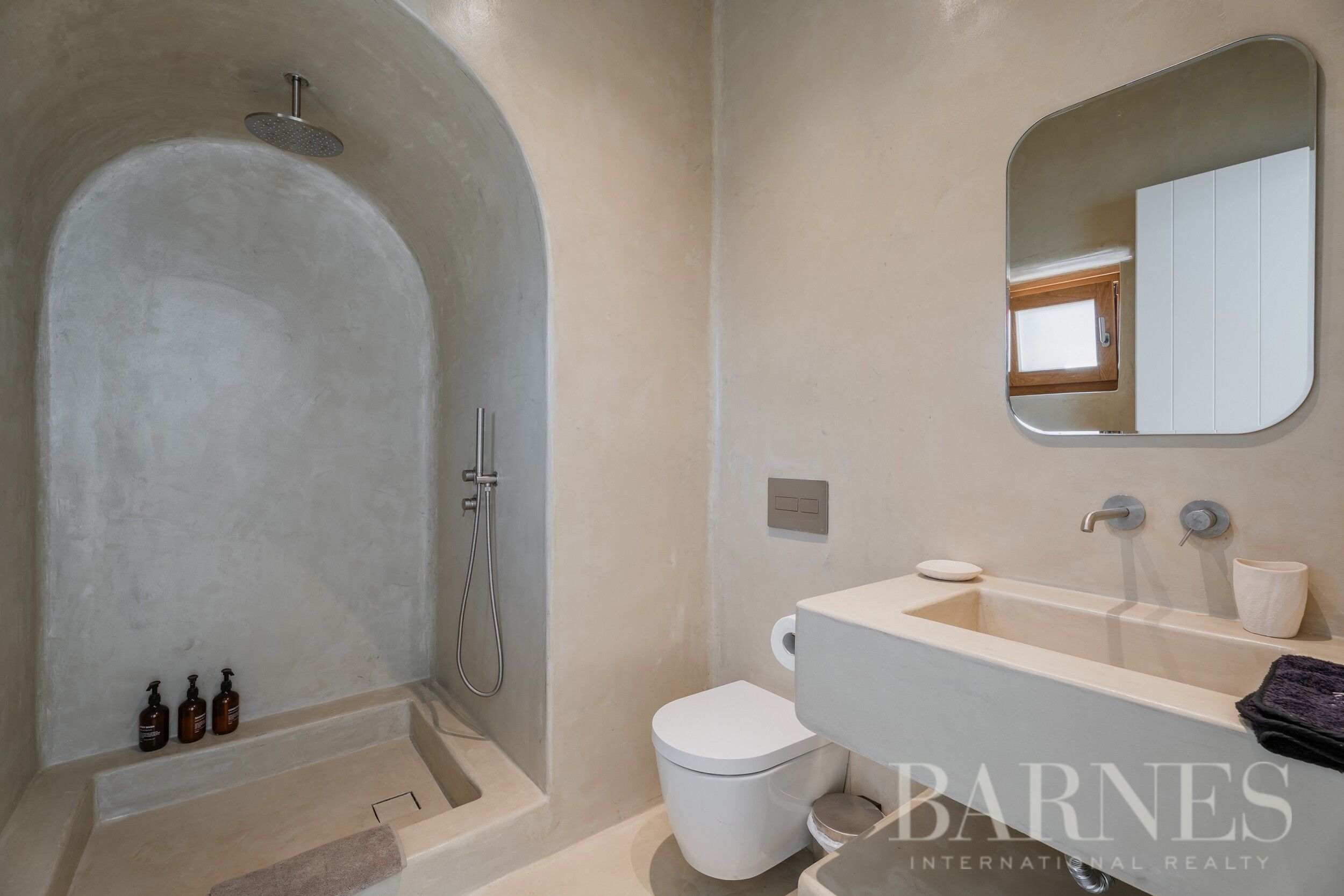 Външната зона предлага плувен басейн, вградена зона за барбекю с кухненски бокс и просторна трапезария, както и множество места за сядане и отдих. Забележително е, че покривът е превърнат в удобно пространство за отдих.