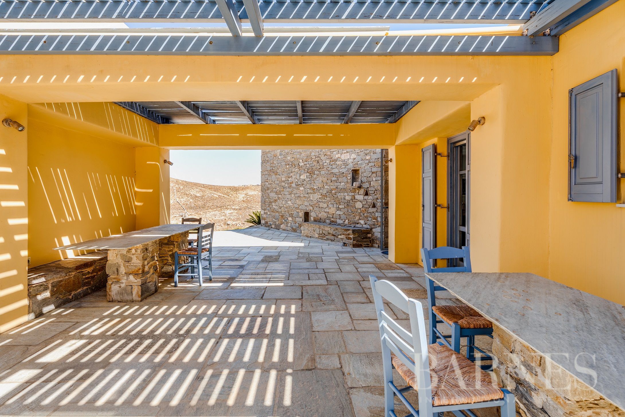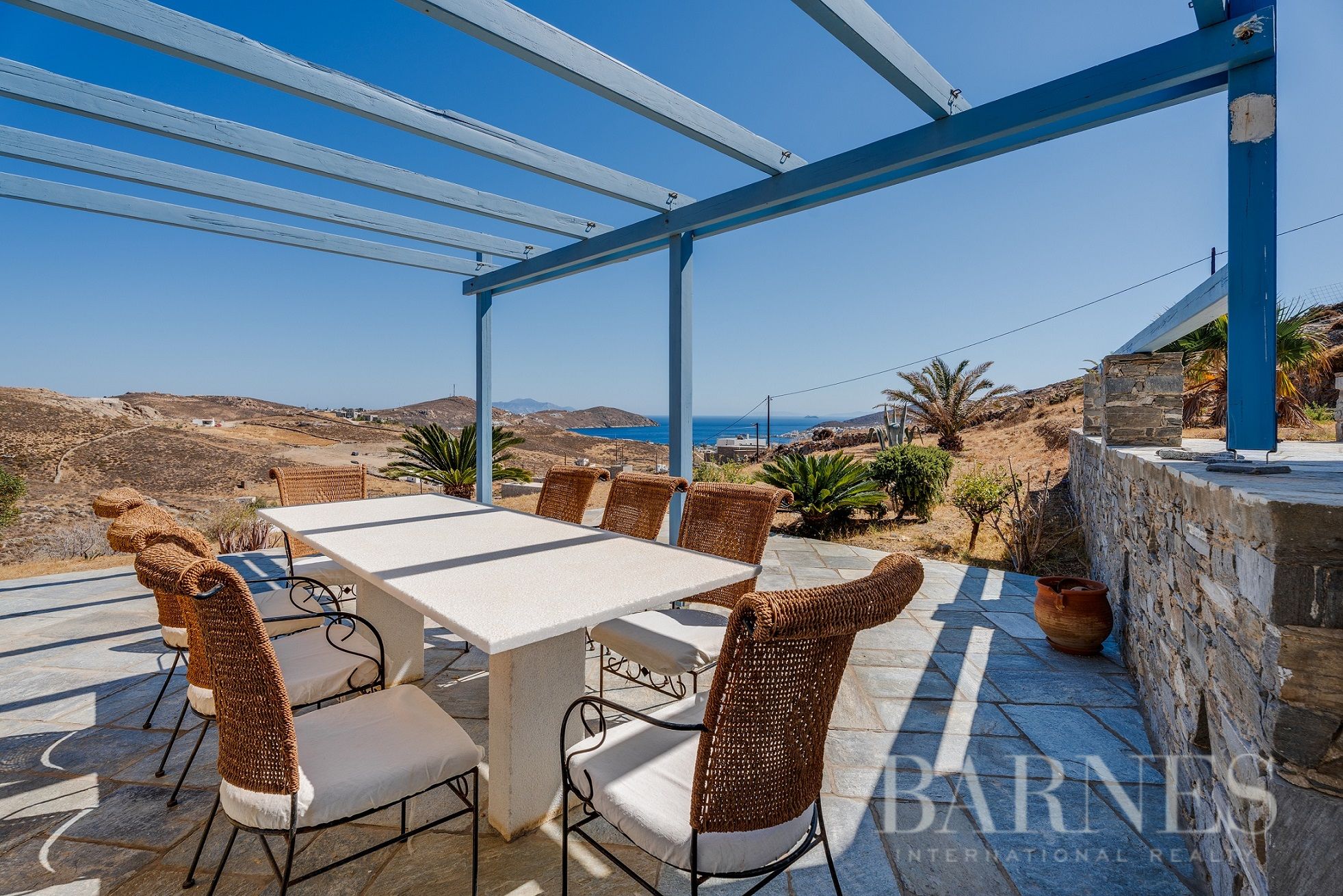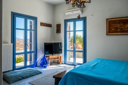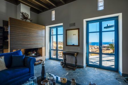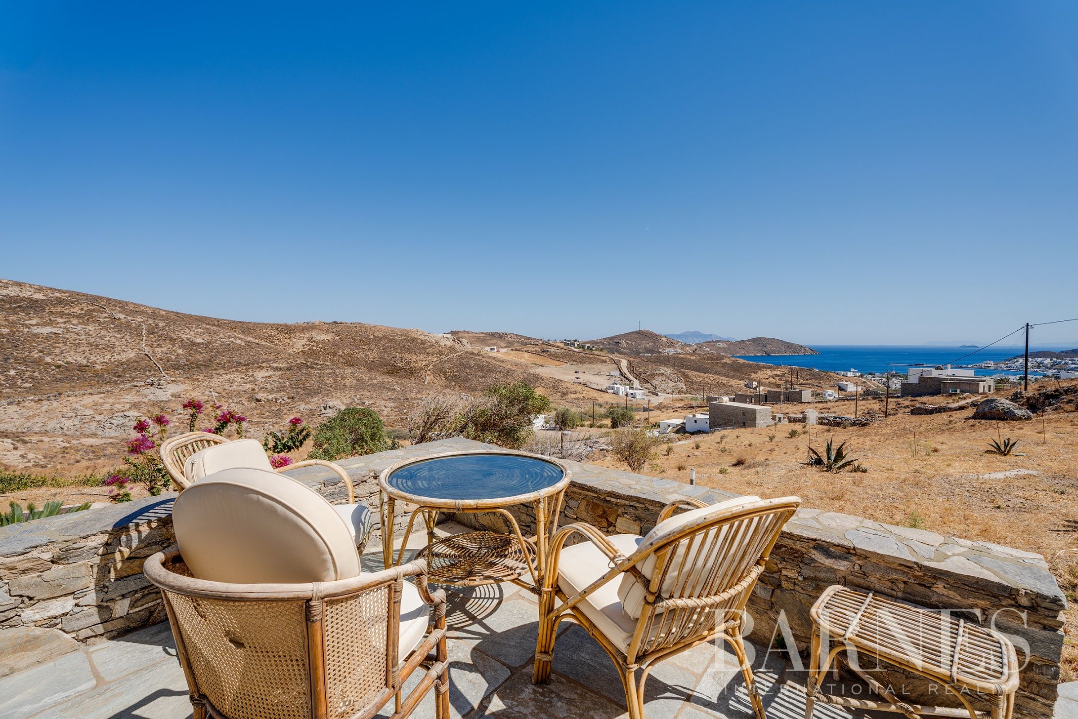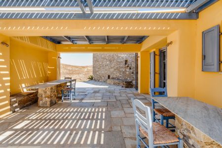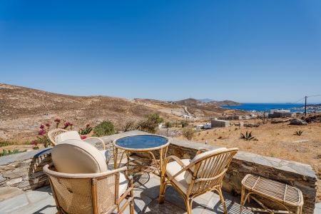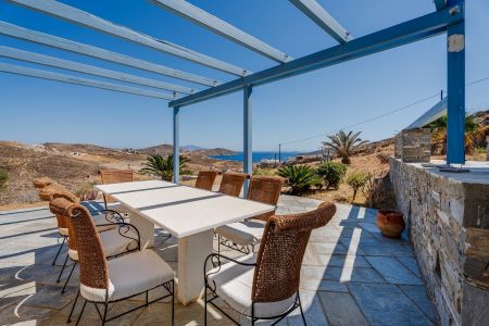 Имотът включва тераси с места за сядане и голяма градина, предлагаща изключителна гледка към морето и цикладския пейзаж.