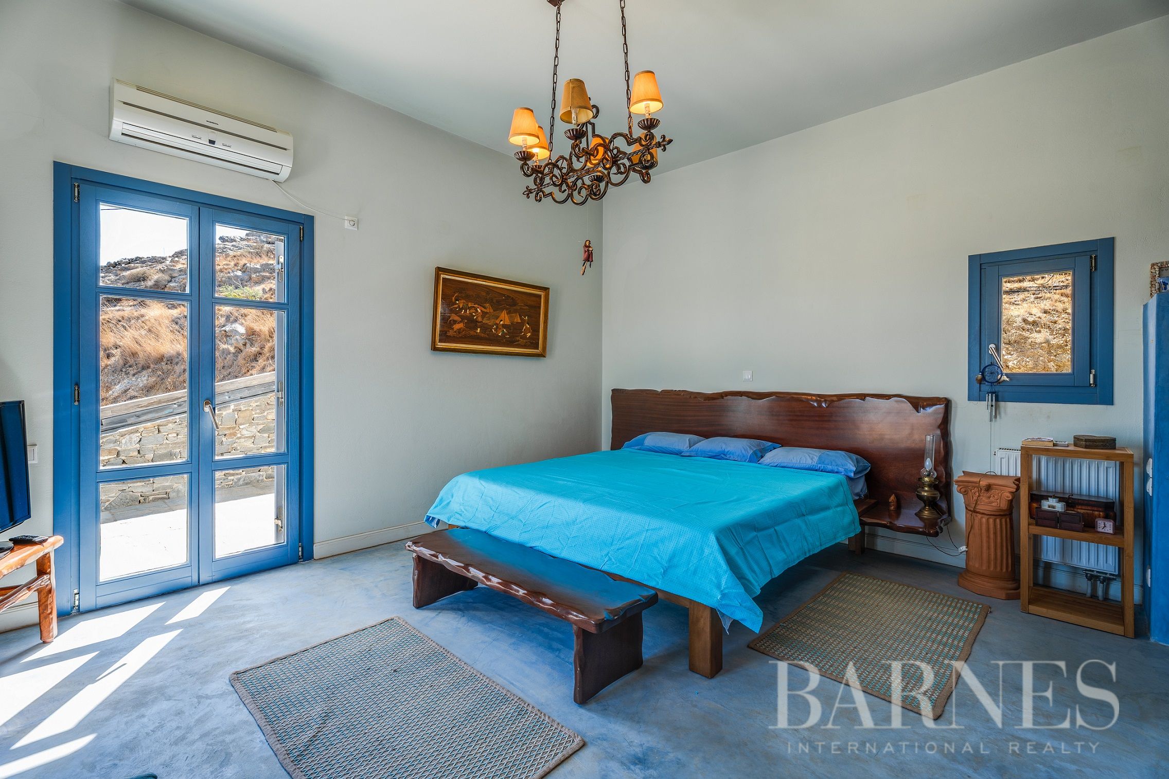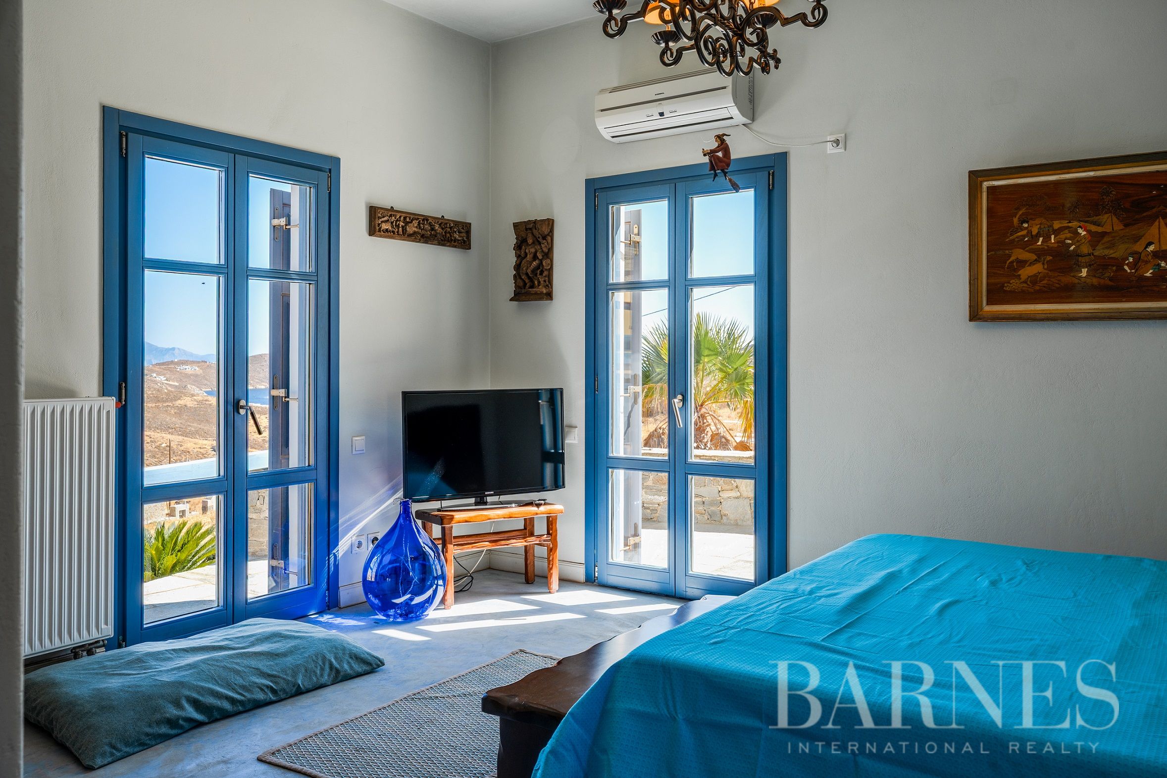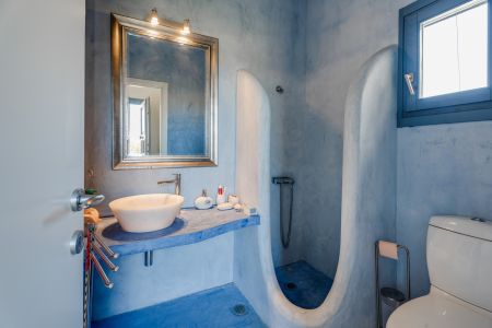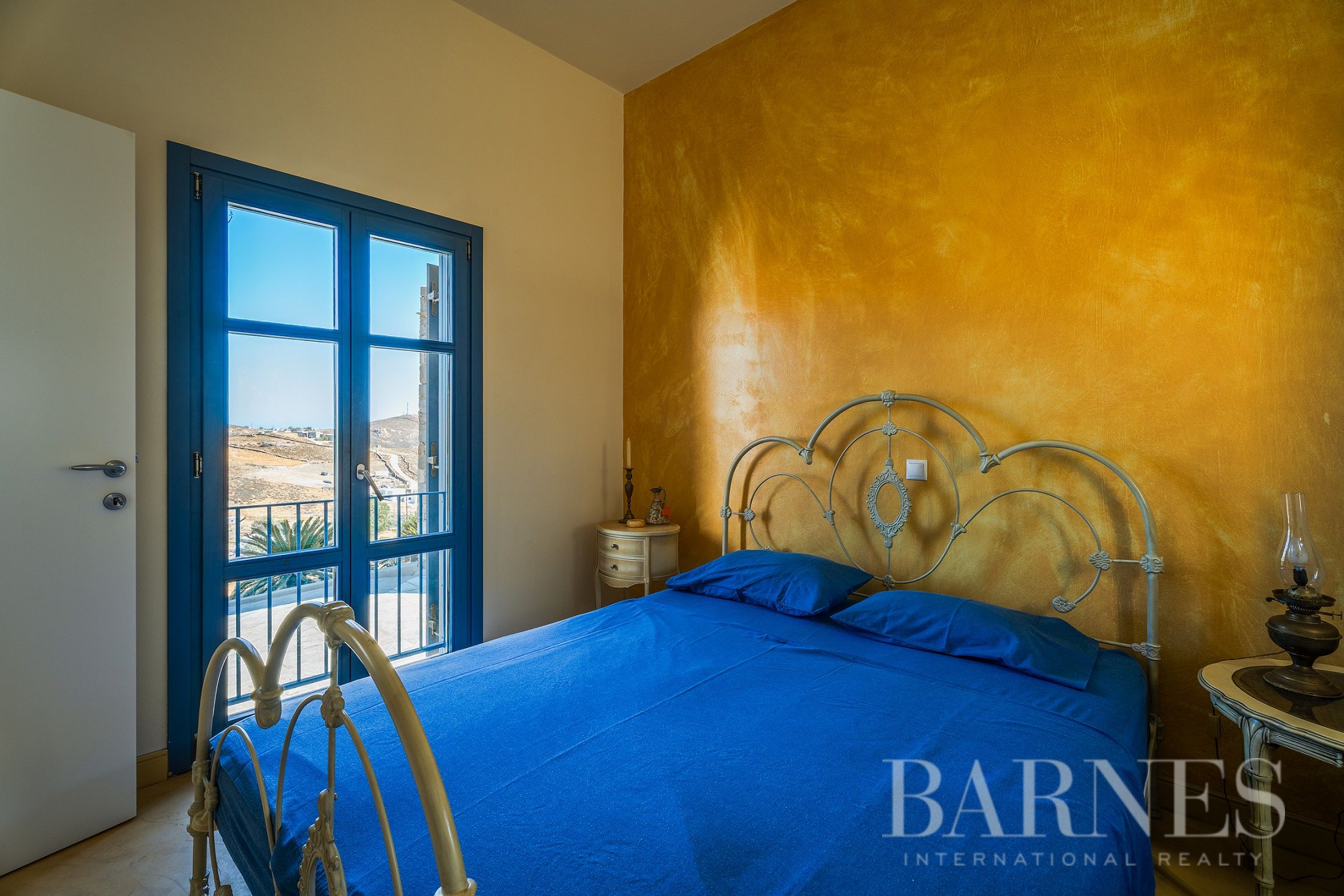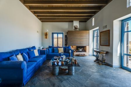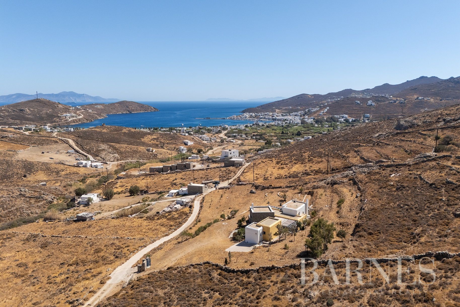 Имотът включва тераси с места за сядане и голяма градина, предлагаща изключителна гледка към морето и цикладския пейзаж.