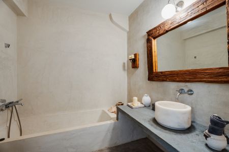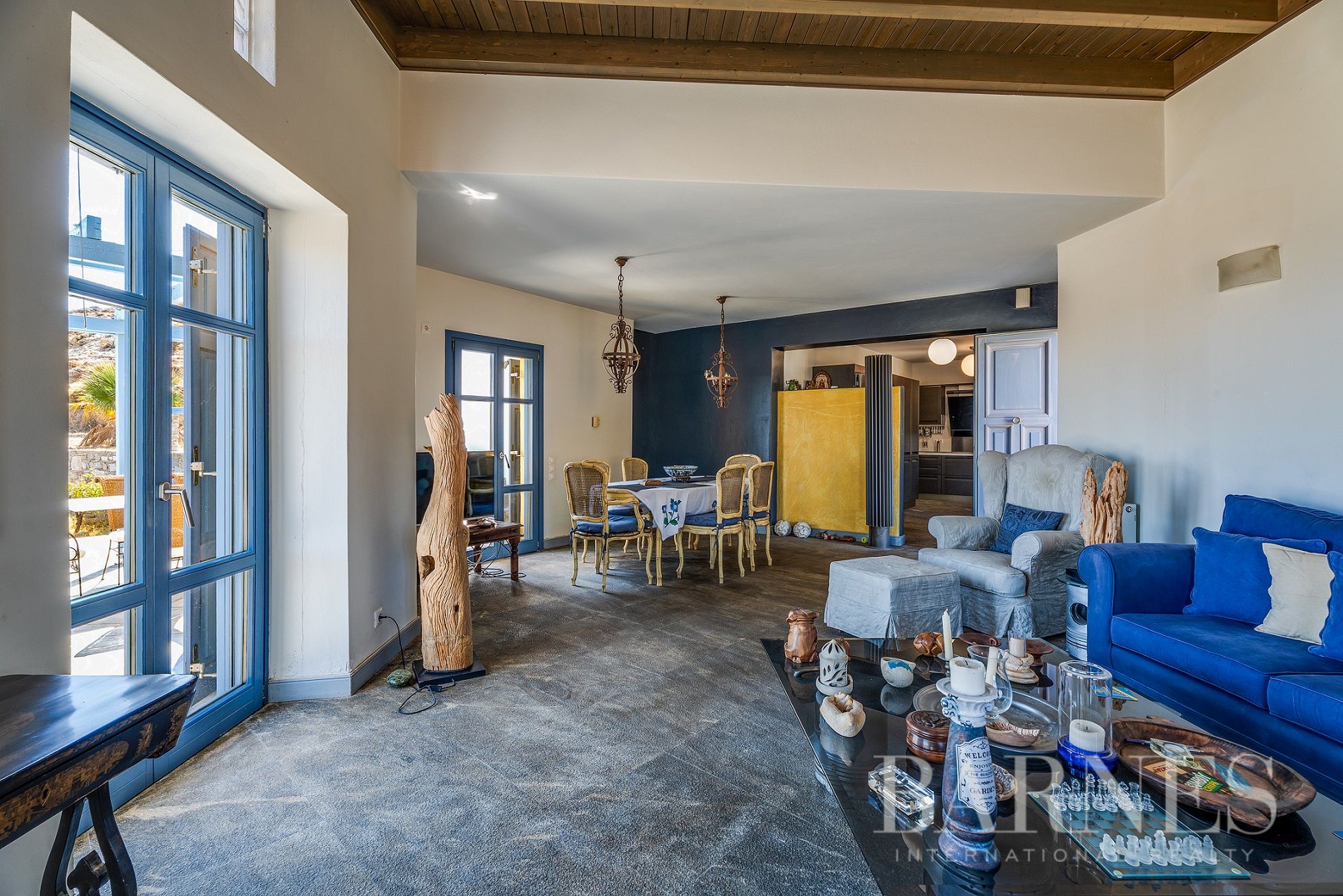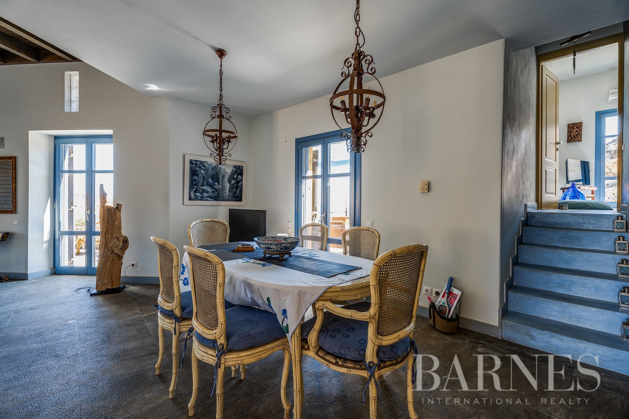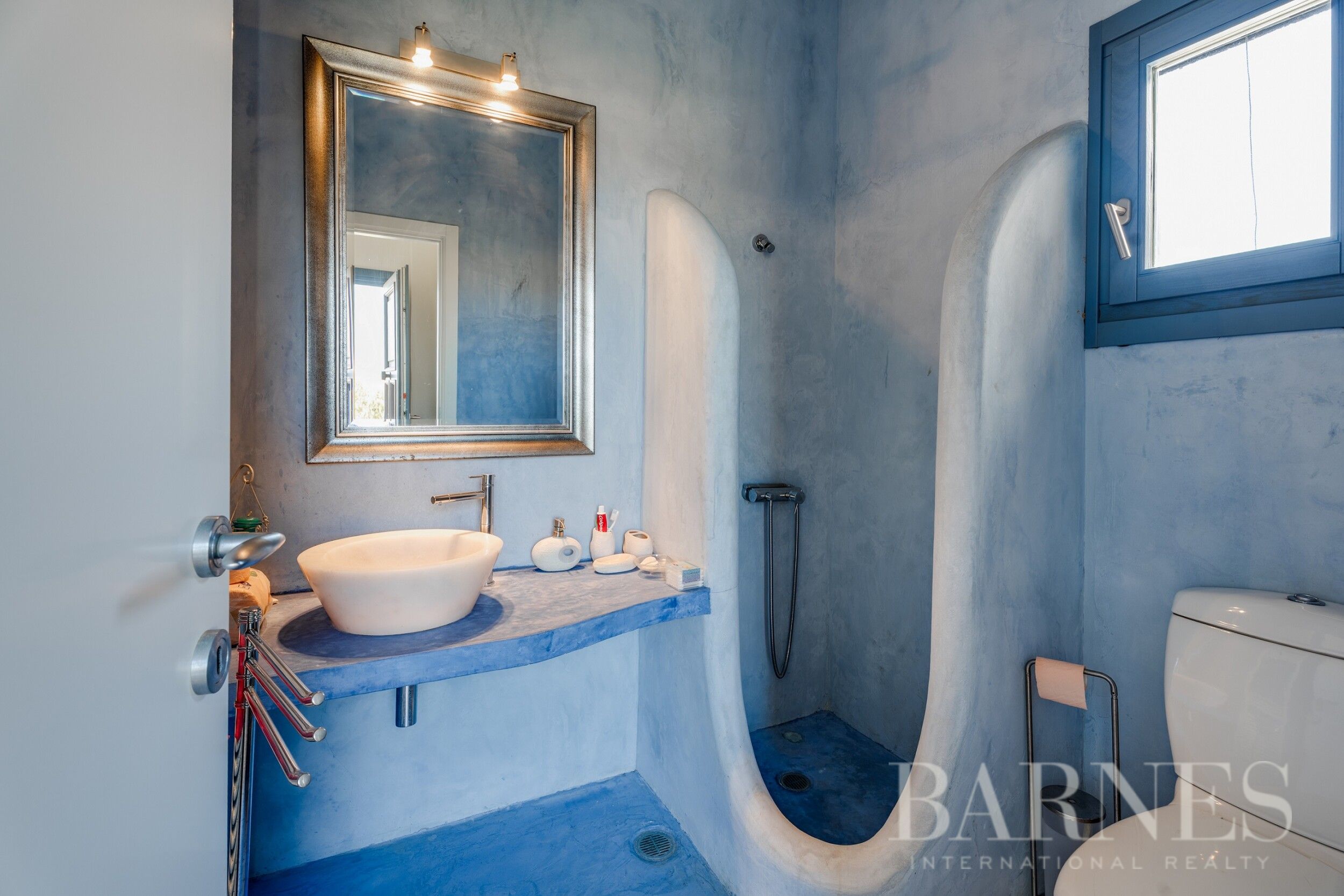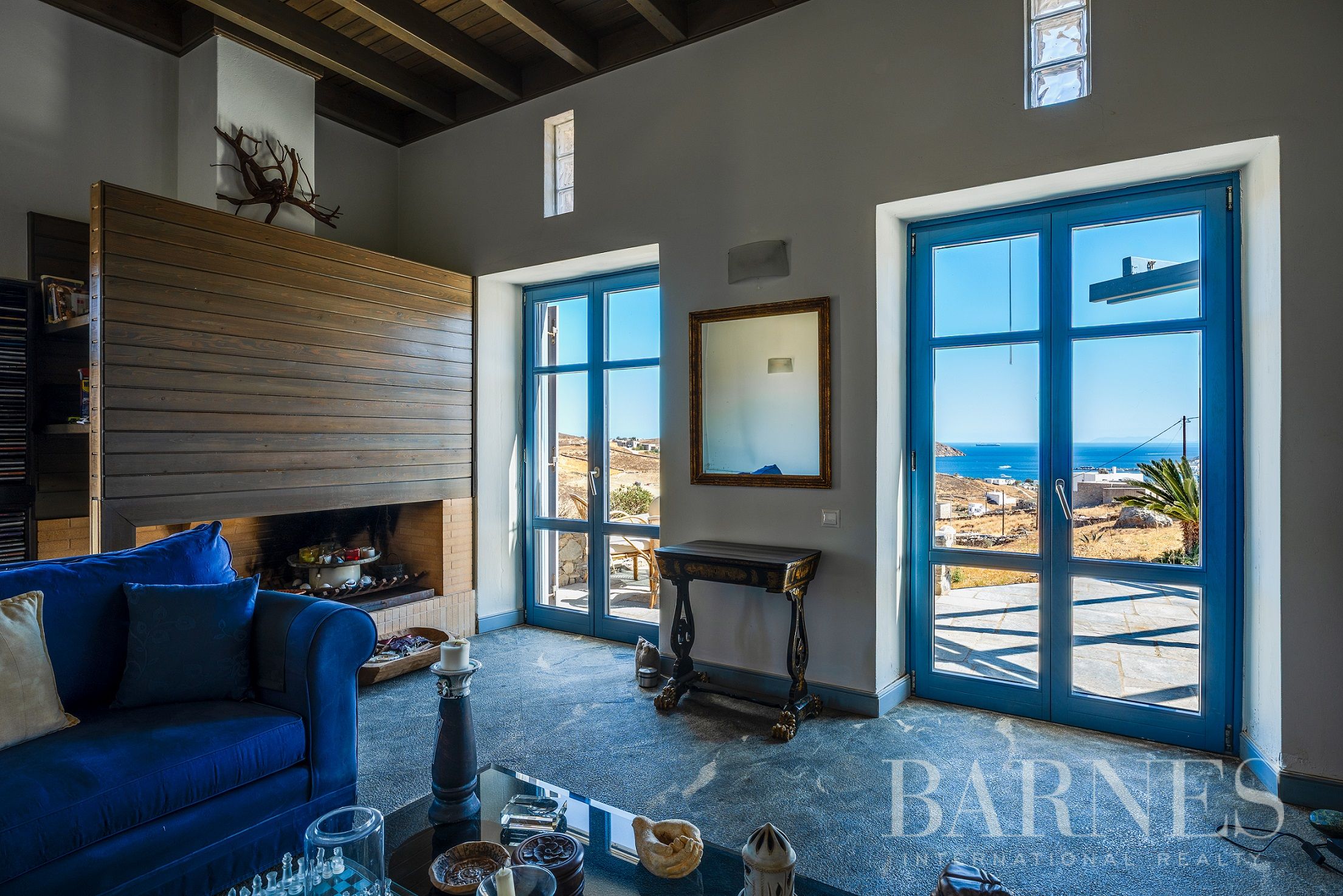 Имотът включва тераси с места за сядане и голяма градина, предлагаща изключителна гледка към морето и цикладския пейзаж.