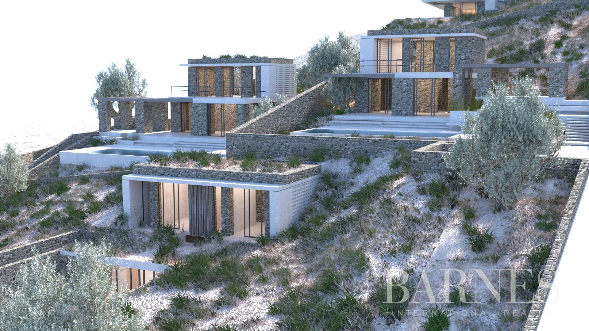 Основният етаж предлага кът за сядане/трапезария с достъп до басейна, просторна кухня, тоалетна и главна спалня със собствена баня. На долния етаж има още 2 спални, които споделят 1 баня.