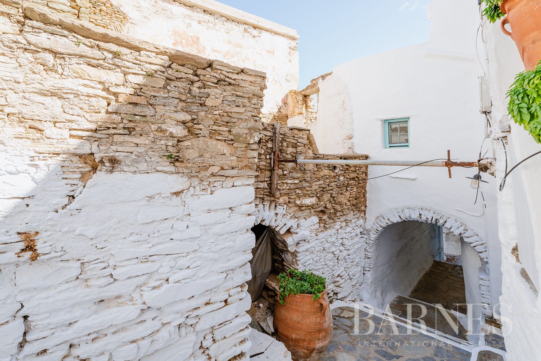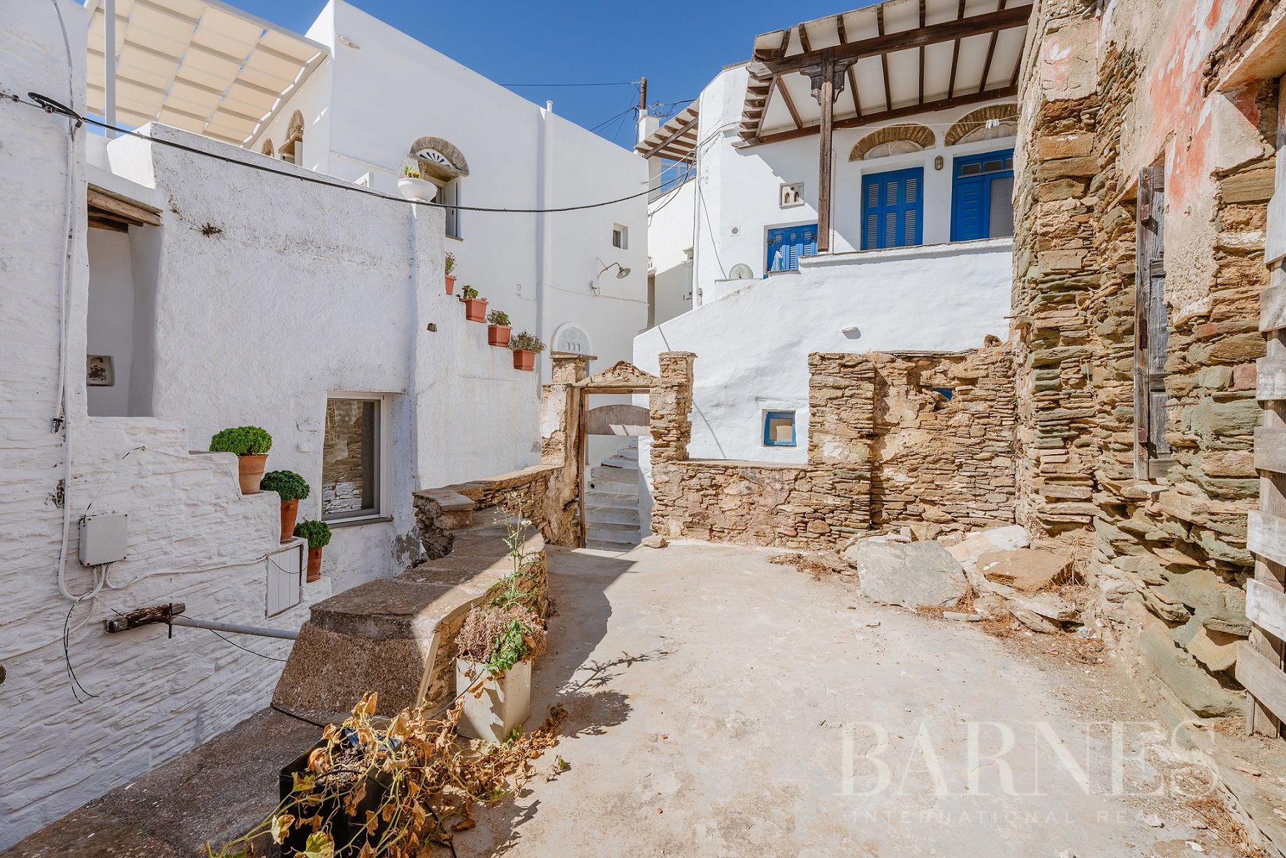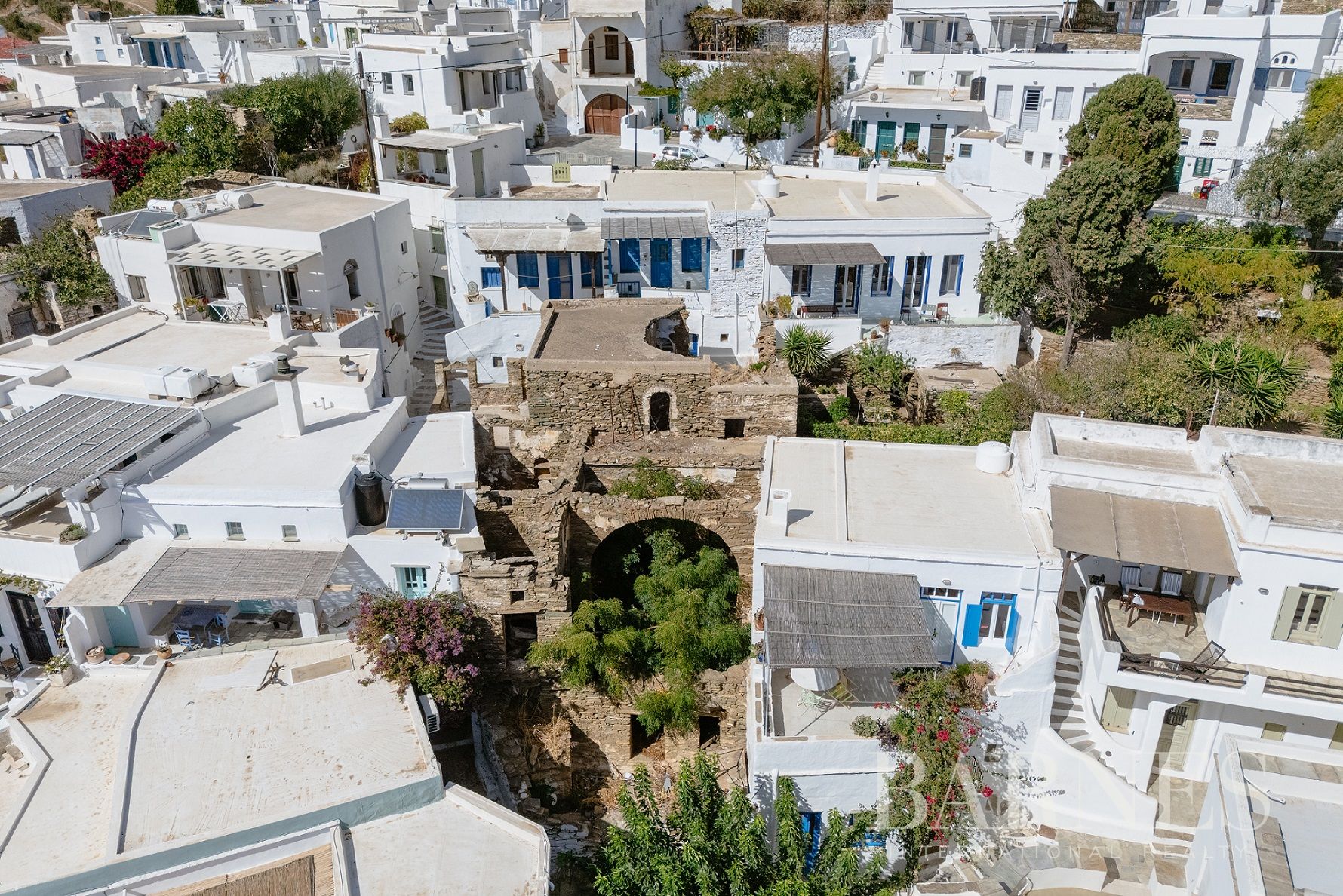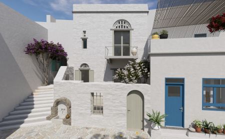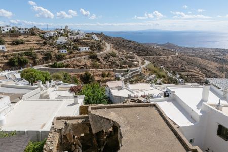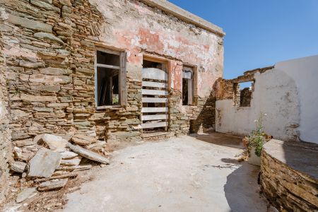 Парцелите са с обща площ от 196 кв.м., докато съществуващите разрушени сгради се простират на 315 кв.м. Местоположението предлага безпрепятствена гледка към егейския пейзаж, а имотът уникално съчетава автентичността на цикладската архитектура с потенциала за впечатляващ ремонт.