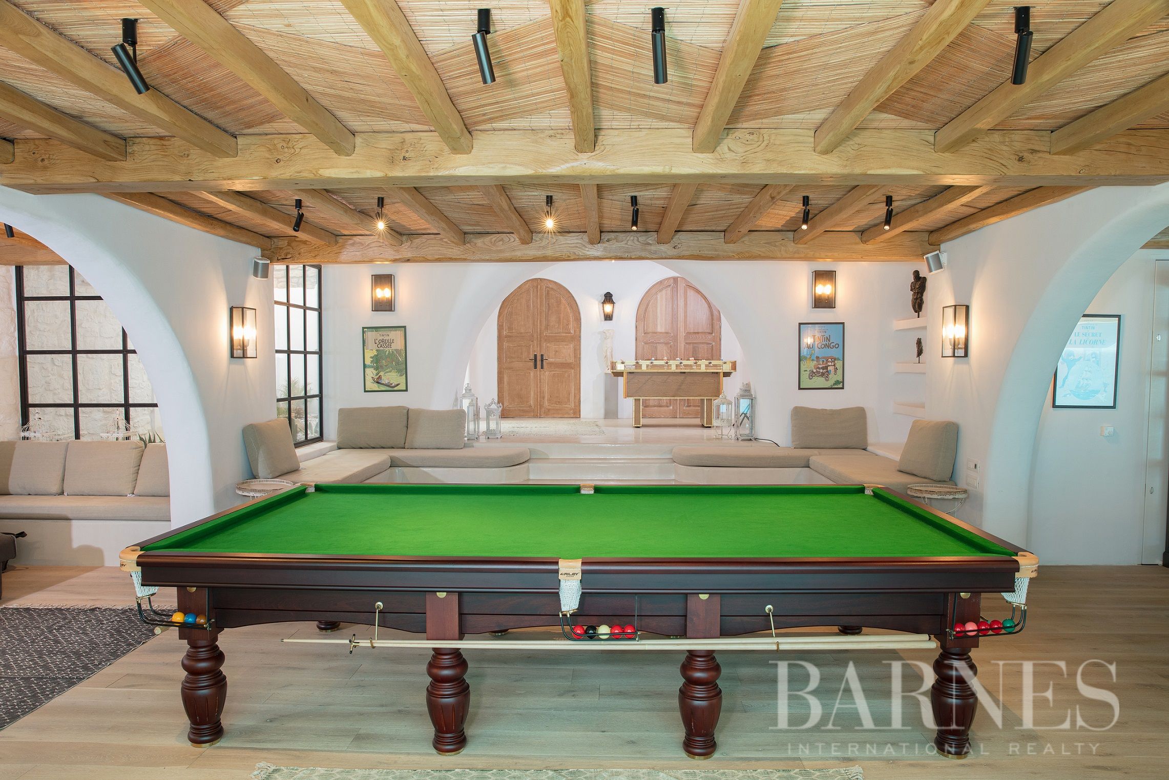 Външната зона предлага голям инфинити басейн, както и два по-малки басейна с множество места за сядане, голяма модерна трапезария и външна кухня с барбекю. Богато озеленената градина обгражда имота с различни видове цъфтящи храсти и дървета и предлага панорамна гледка към морето и залеза. В околността има и самостоятелна къща за гости с 1 спалня и 1 баня.