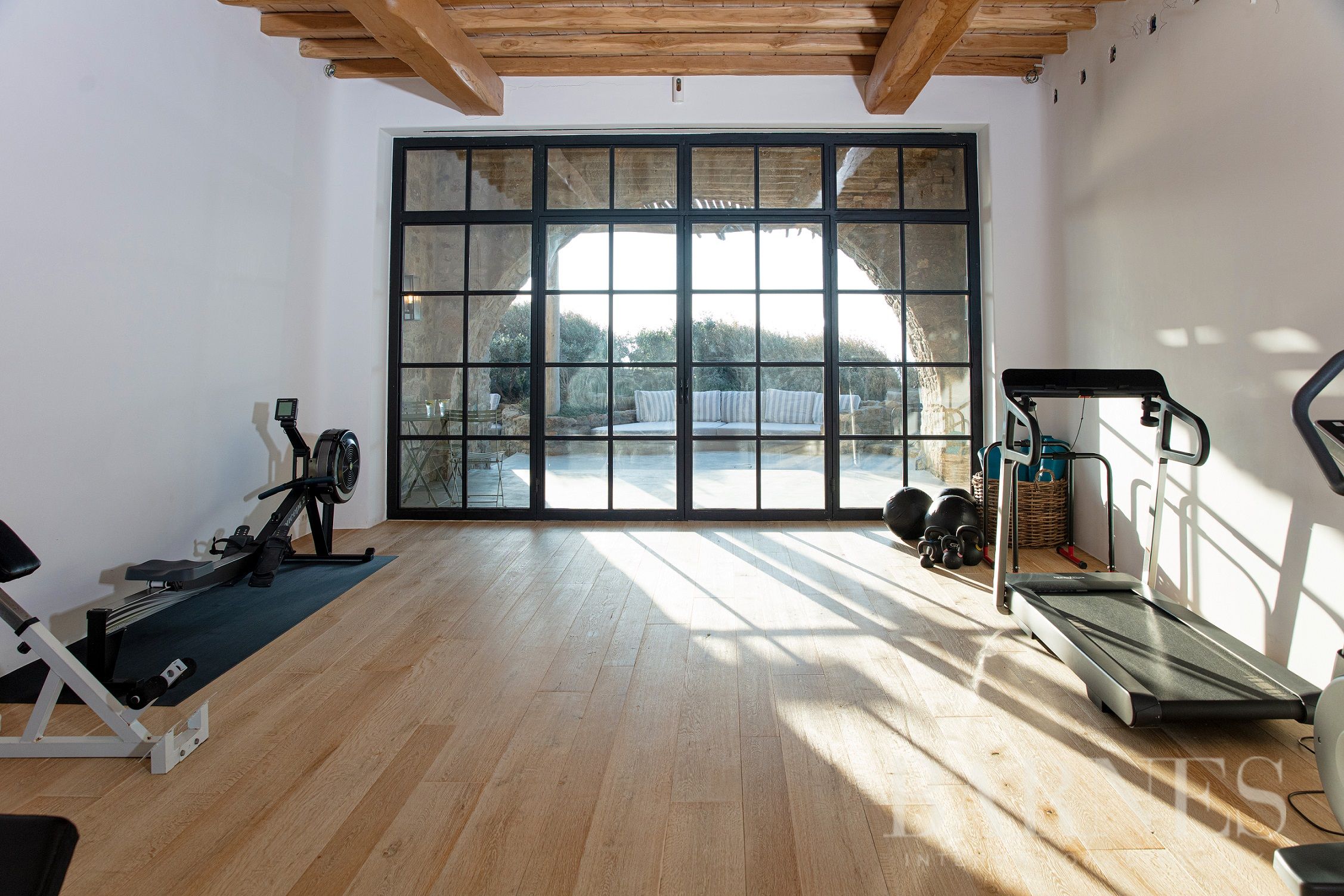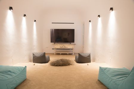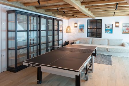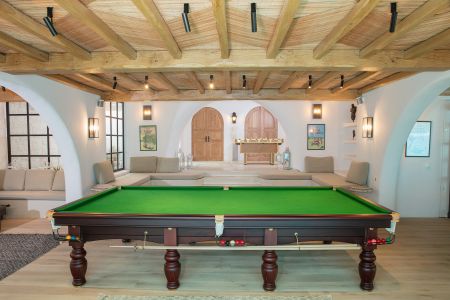 Долното ниво, което поради наклона на терена също е на нивото на земята, включва просторна стая за игра, домашно кино, спа зона с тоалетна, фитнес зала, голяма всекидневна, перално помещение, помещение за механично оборудване и множество складови помещения. На същото ниво има 6 спални със самостоятелни бани, всички с достъп до балкон или градина.