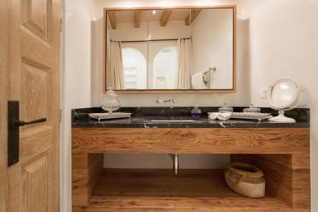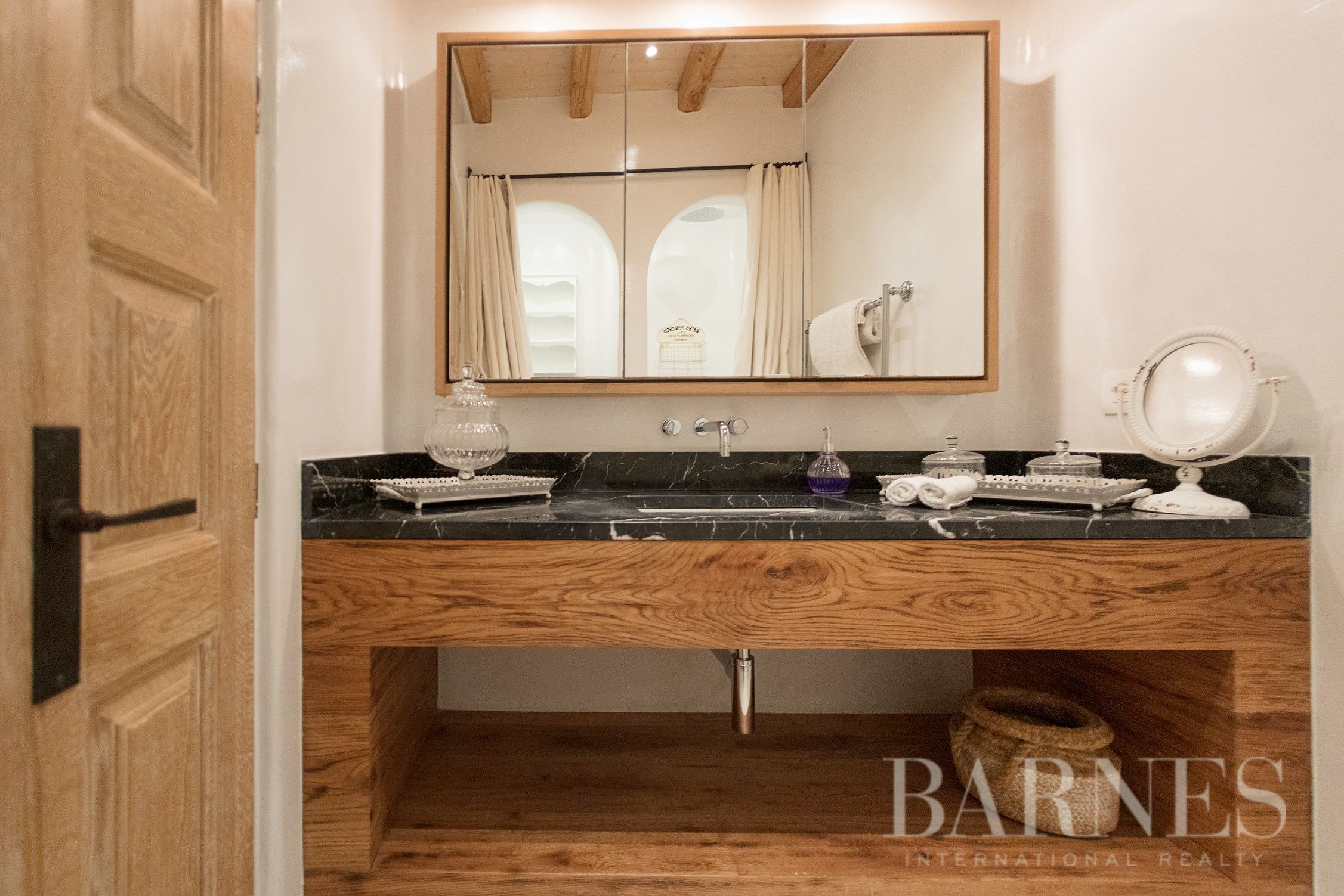 На горния етаж се намира главната спалня с красива баня и достъп до балкон с изглед към морето. На същия етаж има допълнителна всекидневна и още 1 спалня, и двете с достъп до големи балкони с изглед към морето.