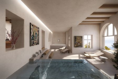 Разположен върху парцел от 4000 кв.м., той е ограден от традиционни каменни стени, които осигуряват абсолютна поверителност и безпрепятствена панорамна гледка към Егейско море, Сароническия залив и Пелопонес.